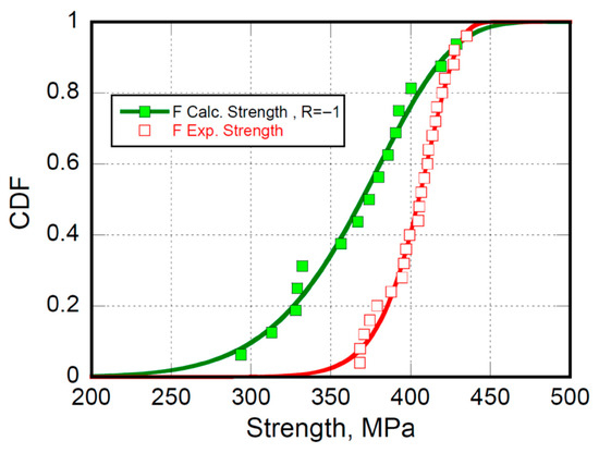 The calculated compression strength Weibull distribution function, obtained using Equation (3) by pooling the experimental fatigue data at different and compared to the experimental static strength data. The correlation coefficient is φ = 0.99 for the experimental and calculated data.