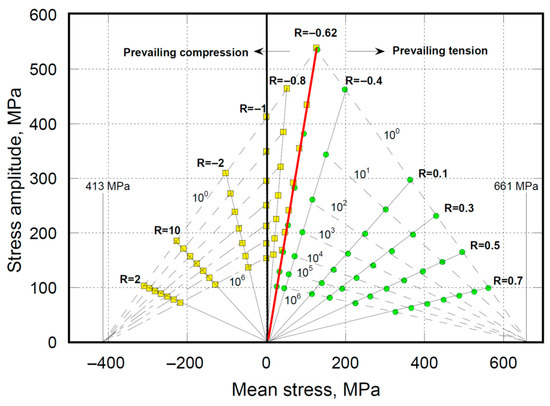 The CLD diagram was recovered by applying Equation (8) at different stress ratios, R. The yellow and green symbols represent the theoretical compression- and tension-dominated fatigue lives, respectively.