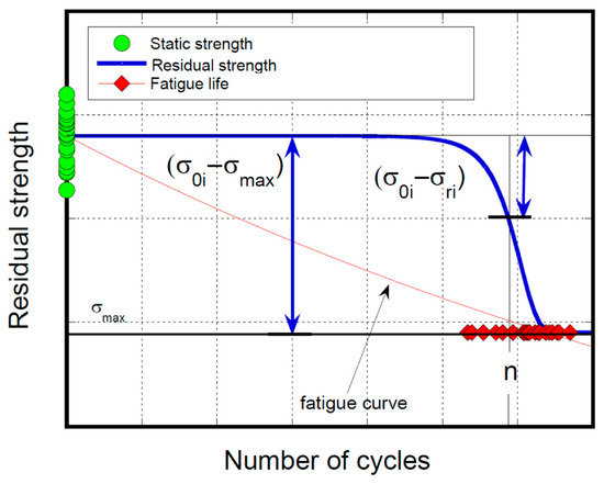 Under uniaxial and constant amplitude (CA) loadings, and ignoring the environmental and frequency conditions, the residual strength, can be expressed in its implicit form as a function of the static strength, the current loading cycle, n, the maximum applied stress, and the loading ratio, :