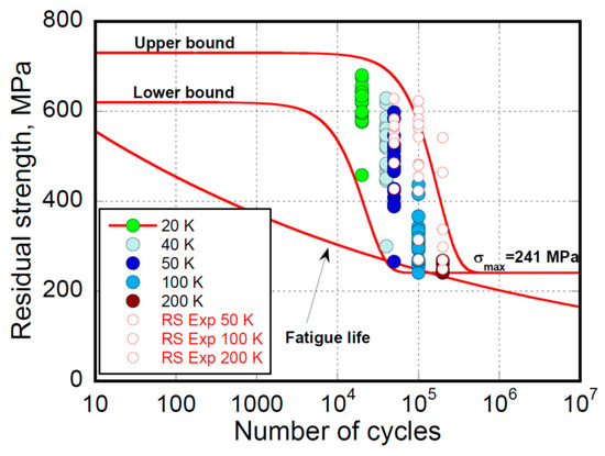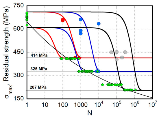 The experimental and calculated residual strength data under pure tension fatigue loading ( at different elapsed cycles are reported in Figure 10. According to the theoretical expectations, the experimental data are confined between the strength degradation curves starting from the extreme tails of the static strength distribution and falling at the extreme tails of the fatigue life distribution when the residual strength equals the maximum applied stress, . Similarly, residual strength data and the corresponding theoretical domains are reported in Figure 11 for pure tension loading at different applied maximum stress, namely = 414, 325, and 207 MPa. Again, the sparse data are well confined within the domains described by the corresponding upper and lower-bound degradation curves.
