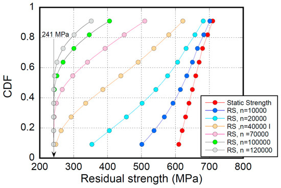 The theoretical residual strength cumulative distribution function can be recovered at any cycle, according to Equation (10). Figure 12 reports the CDF of residual strength at different elapsed cycles of samples fatigued under CA (. In the first decades of the elapsed cycles, the CDFs practically coincide with the static strength and are not reported for convenience. As the cycle progression continues, the distribution widens towards lower strengths until the CDF truncation occurs at longer elapsed cycles, as some weaker samples have progressively failed.