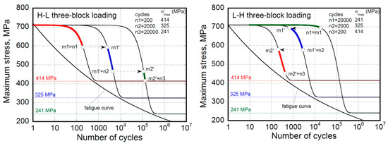 For the case illustrated in Figure 13, the number of cycles to failure, Ni, are 600, 10,000, and 300,000, and the block extents, ni, are 200, 2000, and 20,000 cycles, at 414, 325, and 241 MPa, respectively, so the damage calculated by Miner’s rule (MR) in ascending and descending sequences is DMR = 0.60.