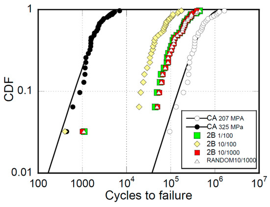 Furthermore, the SRSLERA and ERSA approaches cannot discriminate between the hypothesized stress interaction effects [32,33,34], namely the transitions from low to high-stress levels and vice versa. A few data on the matter, with sound statistical significance, are available in the literature. Wahl [36] analyzed the lifetime responses to two-block testing to study both the effect of a simple spectrum on fatigue and the sequencing of cycles within the spectrum. Testing the sequence effect involved applying ten cycles of high-stress level ( within 1000 cycles of a lower stress level ( until failure. Three cases were chosen: (1) one high amplitude cycle followed by 100 low; (2) ten high amplitude cycles followed by 1000 low; and (3) ten high amplitude cycles randomly interspersed within 1000 low. 82 two-block and 38 constant amplitude tests were performed for R = 0.1. No significant differences were found among the resulting statistical lifetimes, which appeared almost superimposed. Thus, it was unclear whether the cycle-mix effect is irrelevant to the material or whether the widespread statistical results mask it. Our simulations on the same material subjected to the same loading conditions are reported in Figure 14. Based on the model’s parameters, α and β, and the Weibull static strength parameters, γ and δ (Table 4), the statistical lifetimes for each loading sequence were predicted by selecting 30 equispaced values from the static strength distribution and applying the procedure described in Equations (14)–(17) cycle-by-cycle. The routine was stopped, and the sample virtually failed when the percentile residual strength function, Equation (12), degraded to = 0.95 in the vicinity of 325 MPa. The responses to the three different two-block loadings are practically indistinguishable and intermediated between the CA lifetimes, as experimentally found. Additional two-block results were obtained by increasing the extent of high-to-low block cycles to 10/100, revealing that the lifetimes shift towards the high-amplitude CA response and highlighting the block extent effect on two-block repeated loadings.