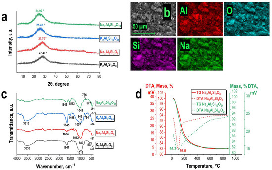 FTIR spectra (Figure 1c) are sufficiently informative for investigating the structure of X-ray amorphous aluminosilicates and contain a large number of characteristic absorption bands assigned to aluminosilicate materials according to available literature [27,28]: a broad band with a maximum in the 1042–1018 cm−1 region corresponds to asymmetric stretching vibrations of Si-O-Al bonds, the absorption band at 434–451 cm−1 is caused by vibrations of bridging Si-O-Si bonds, a shoulder in the 889–943 cm−1 region corresponds to vibrations of terminal Si-O bonds, and bands at 776–794 cm−1 and 572–578 cm−1 are attributed to deformation vibrations of the silicon-aluminum framework. Additionally, FTIR spectra of the initial samples contain absorption bands in the 3535–3613 cm−1 and 1645–1654 cm−1 regions, assigned to stretching and bending vibrations of water. For sodium-substituted samples, the characteristic water absorption bands exhibited higher intensity, indicating an increased degree of hydration of sodium-substituted aluminosilicates compared to potassium-substituted ones.