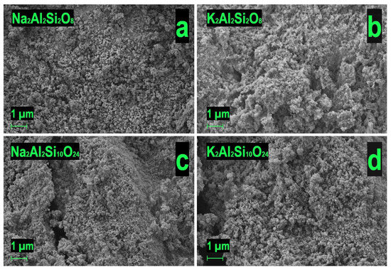 SEM-images of (a) Na2Al2Si2O8, (b) K2Al2Si2O8, (c) Na2Al2Si10O24, (d) K2Al2Si10O24.