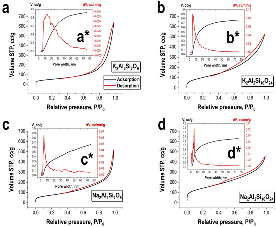 Low-temperature adsorption–desorption isotherms and DFT pore size distributions (Figure 3) allow detailed investigation of the differences in porous structure of the synthesized aluminosilicates. In terms of shape, the obtained isotherms belong to Type III according to IUPAC classification [29] and are characterized by the absence of a plateau at high P/P0 values, indicating the presence of large macropores in the material structure. In the low relative pressure P/P0 region, a characteristic plateau is present, indicating micropore filling. It should be noted that the micropore volume increases with increasing Si/Al ratio, which is explained by the decrease in material particle size (Figure 2). The hysteresis loops belong to H3-H4 type, indicating a slit-like pore shape between material particles. The pore size distributions constructed using the DFT method (Figure 3a*–d*) demonstrate significant differences between sodium-substituted and potassium-substituted materials. The K2Al2Si2O8 sample with Si/Al = 1 exhibited a polymodal pore size distribution with the largest contribution from mesopores with diameter dp = 15 nm. As the Si/Al ratio increases to 5 for the K2Al2Si10O24 sample, the distribution character changes to monomodal with a dominant diameter of dp = 8 nm. Sodium-substituted samples, in contrast, regardless of the ratio, possess a dominant mesopore diameter of dp = 8–10 nm. For the sodium-substituted Na2Al2Si2O8 sample, an artifact in the micropore region (dp = 4 nm) is also present on the DFT pore size distribution curve, the appearance of which is associated with the sharp closure of the hysteresis loop of the desorption branch (in accordance with [29]).