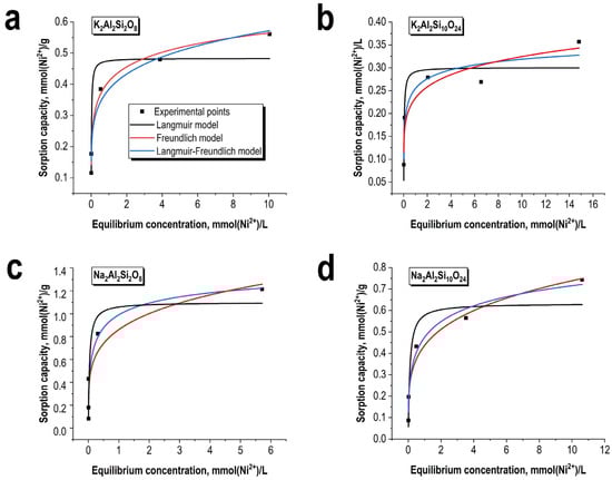 Isotherms of Ni2+ sorption on obtained aluminosilicate materials: (a) K2Al2Si2O8, (b) K2Al2Si10O24, (c) Na2Al2Si2O8, (d) Na2Al2Si10O24.