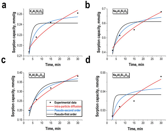 The obtained coefficients (Table 3) reveal complex kinetic relationships. Notably, there is an increase in sorption capacity, determined by pseudo-first and pseudo-second-order equations, for sodium-substituted samples. With increasing Si/Al ratio, sorption capacity also increased for K-substituted samples while remaining relatively constant for Na-substituted ones. These patterns in sorption capacity changes confirm the conclusions drawn from equilibrium adsorption isotherm analysis.
