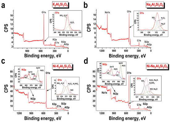 XPS spectra for initial and Ni2+-saturated aluminosilicate materials: (a) K2Al2Si2O8, (b) Na2Al2Si2O8, (c) Ni-K2Al2Si2O8, (d) Ni-Na2Al2Si2O8.
