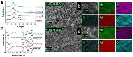 Physicochemical characterization of Ni-saturated aluminosilicate materials: (a) XRD patterns, (b) FTIR spectra, (c,d) SEM images and EDS elemental distribution maps.