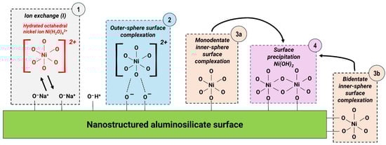 Potential mechanisms for nickel (Ni2+) adsorption on the synthesized aluminosilicates.