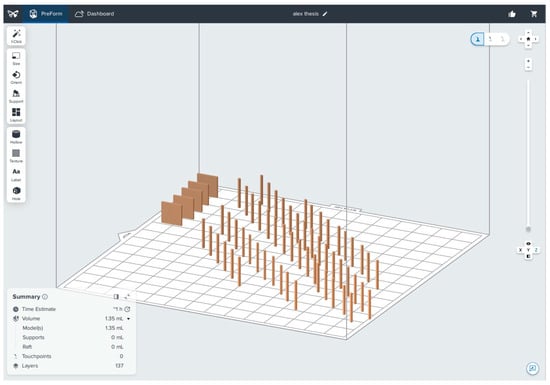 3D printing layout for fabricating sample designs using the PreForm software interface. It shows the arrangement of bars (14 × 1 × 1 mm) and square-shaped specimens (10 × 10 × 1 mm) on the build platform. The orientation and positioning optimize material usage and printing efficiency, while ensuring structural integrity for post-processing.