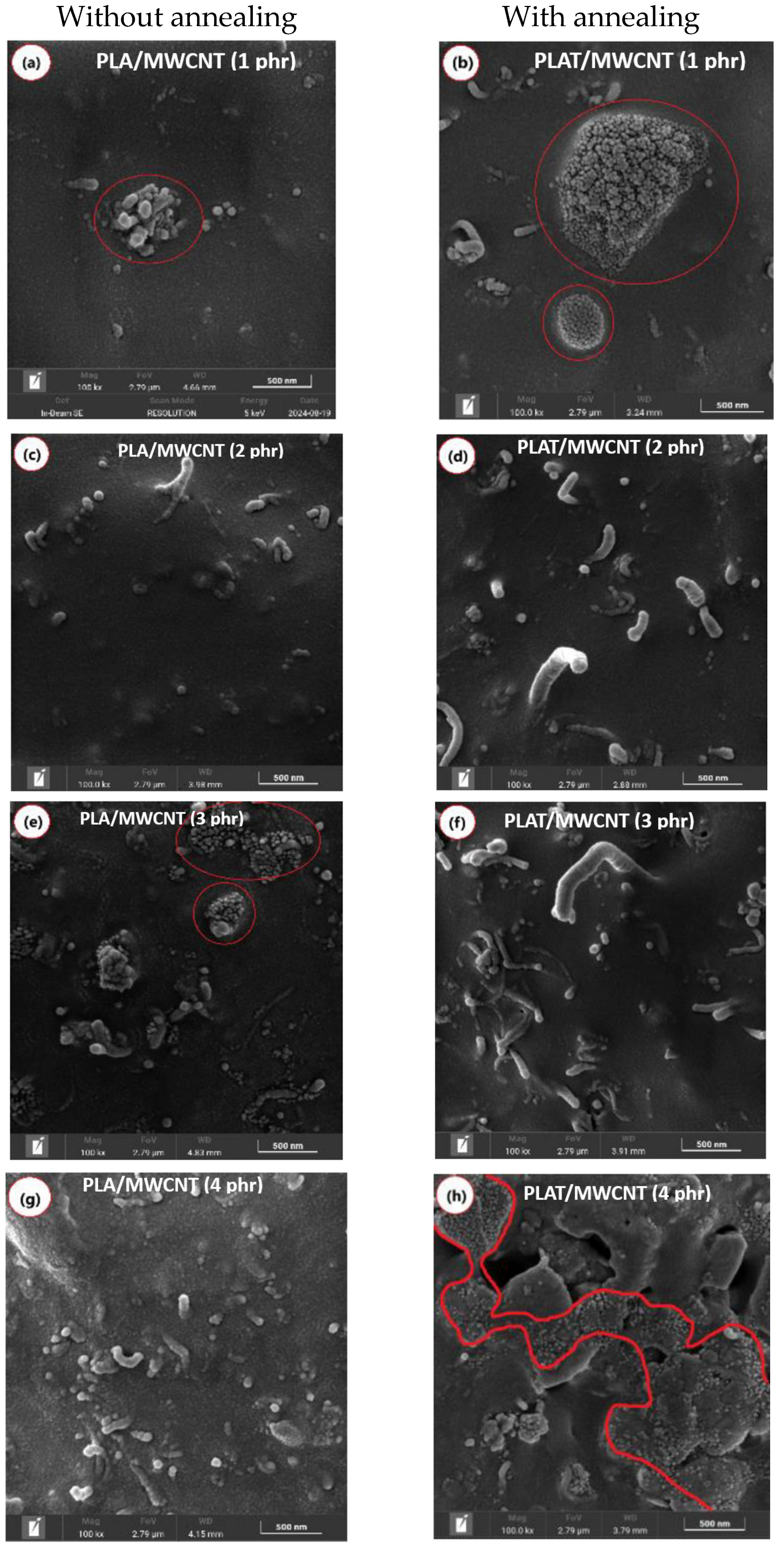 - da Silva, F.U.; Luna, C.B.B.; da Silva, F.S.; Barreto, J.V.M.; Schmitz, D.P.; Soares, B.G.; Wellen, R.M.R.; Araújo, E.M. Exploring the Effect of Annealing on PLA/Carbon Nanotube Nanocomposites: In Search of Efficient PLA/MWCNT Nanocomposites for Electromagnetic Shielding. Polymers 2025, 17, 246. [Google Scholar] [CrossRef]