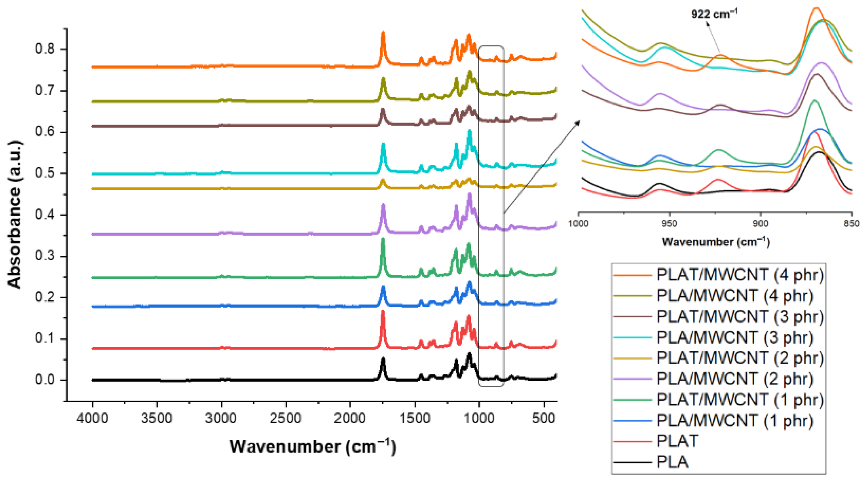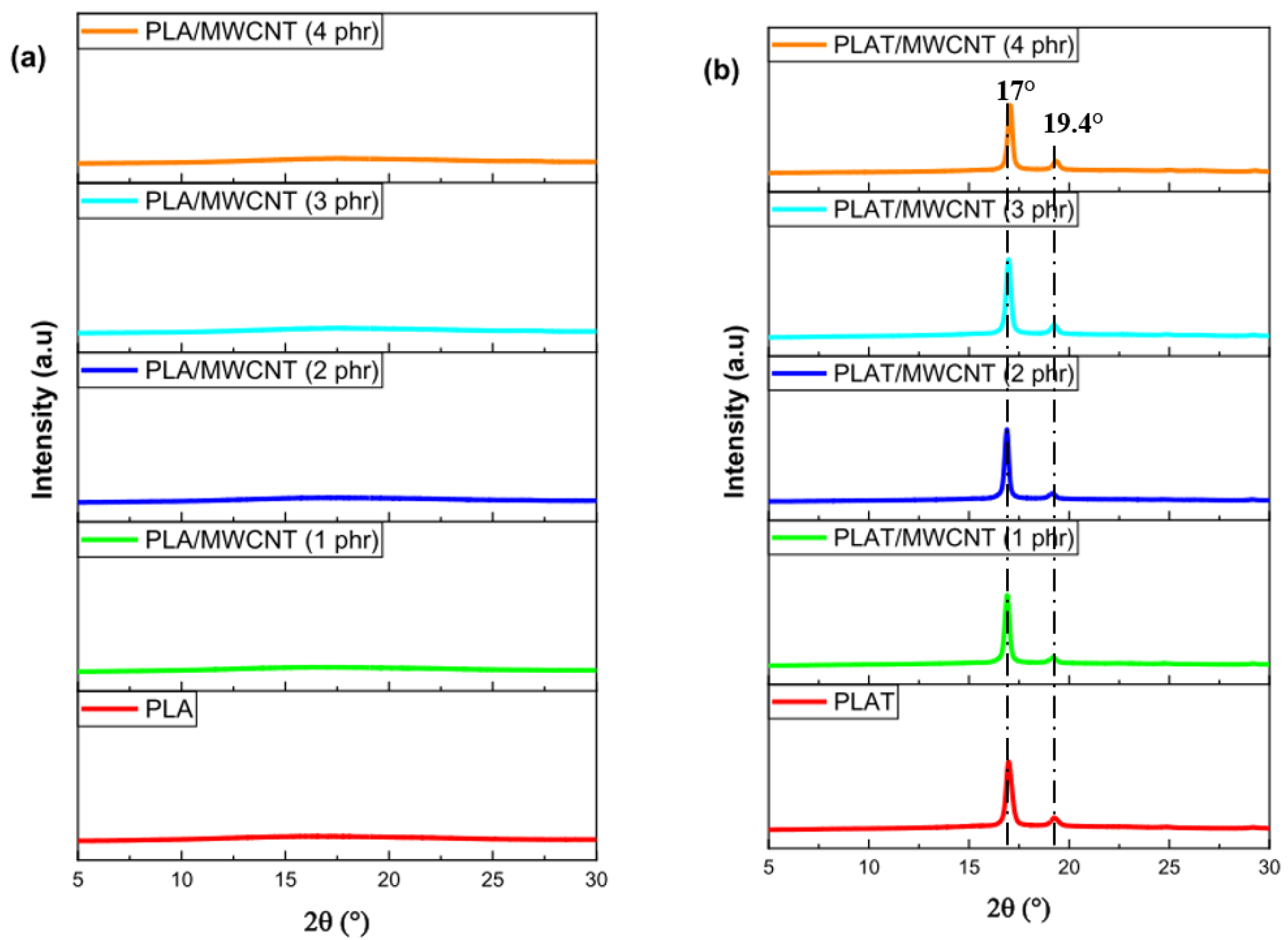 - Younus, M.M.; Naguib, H.M.; Fekry, M.; Elsawy, M.A. Pushing the limits of PLA by exploring the power of MWCNTs in enhancing thermal, mechanical properties, and weathering resistance. Sci. Rep. 2023, 13, 16588. [Google Scholar] [CrossRef]