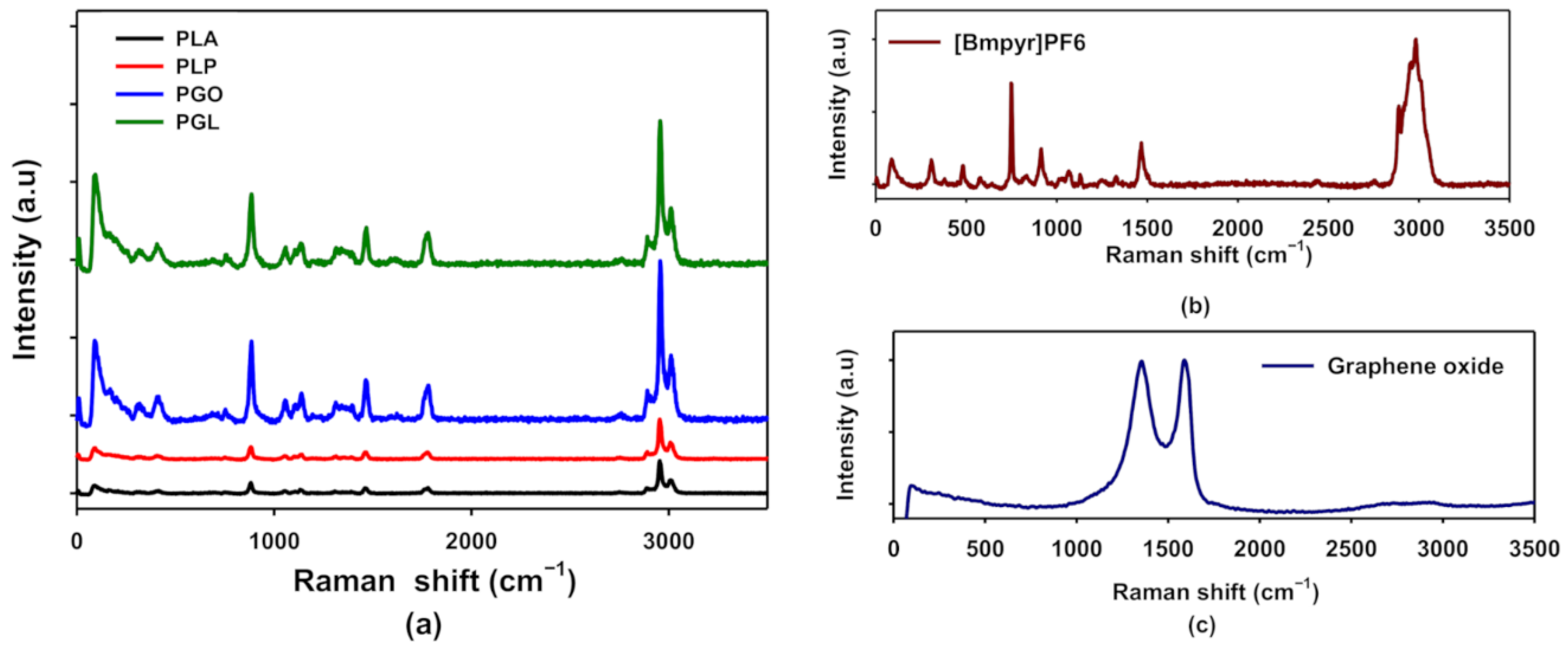 - Sánchez-Rodríguez, C.; Avilés, M.-D.; Pamies, R.; Carrión-Vilches, F.-J.; Sanes, J.; Bermúdez, M.-D. Extruded PLA Nanocomposites Modified by Graphene Oxide and Ionic Liquid. Polymers 2021, 13, 655. [Google Scholar] [CrossRef]
