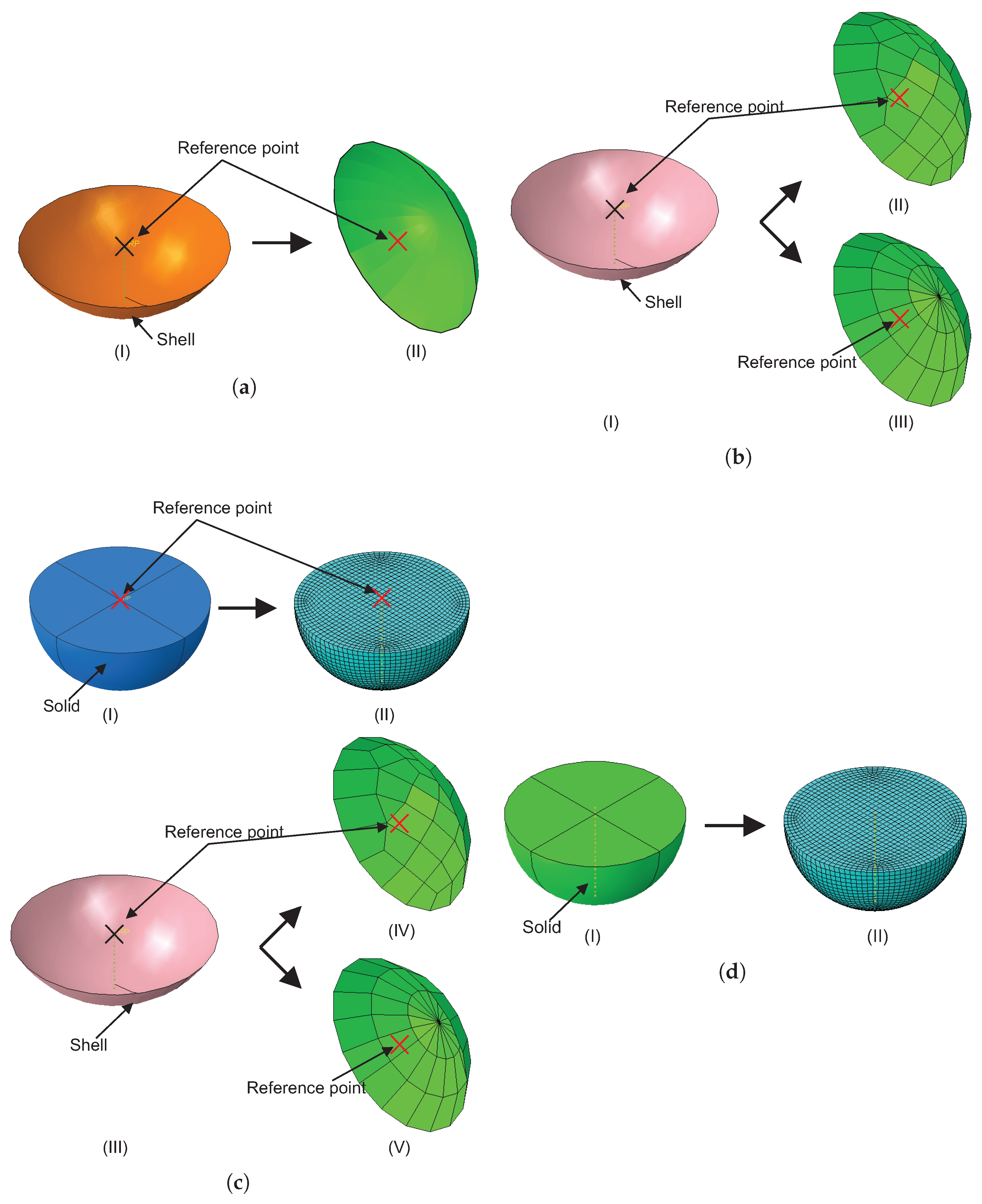 Analytical rigid—This technique requires minimal user input, where the projectile is modeled as a shell, representing the geometry with an associated reference point (RP), as illustrated in Figure 2a(I). In this technique, the user does not explicitly assign the mesh; instead, the element type is internally handled by Abaqus, as shown in Figure 2a(II). All the projectile attributes, e.g., velocity and boundary conditions, are linked to RP.