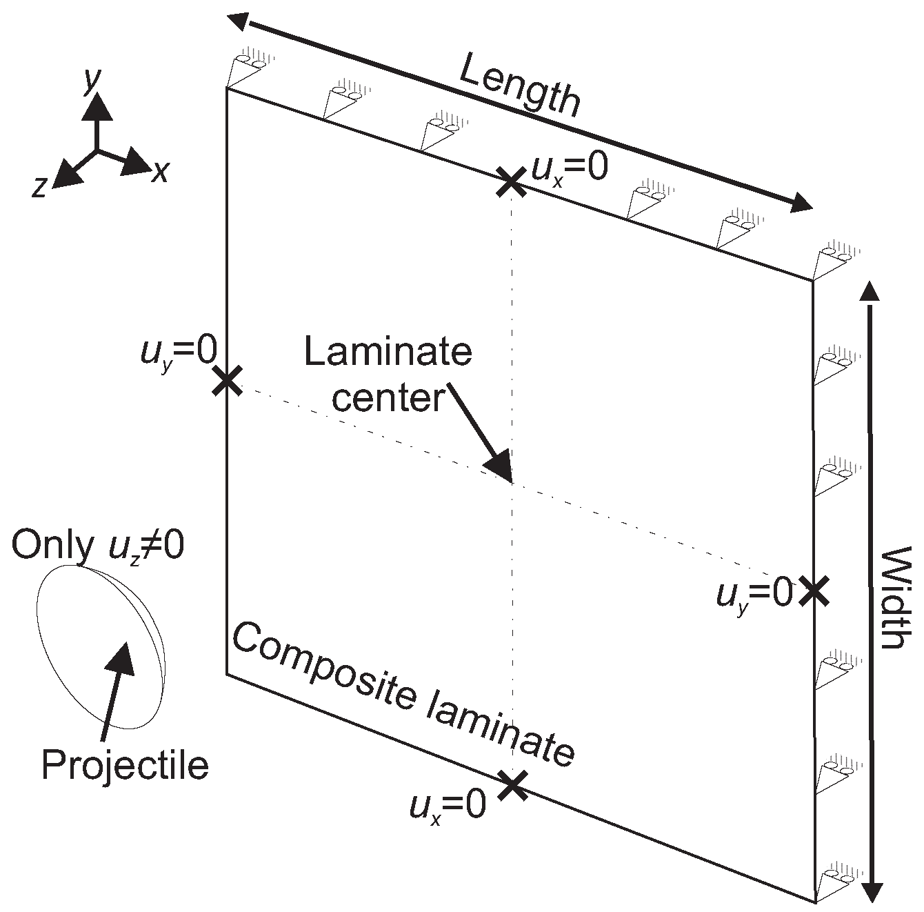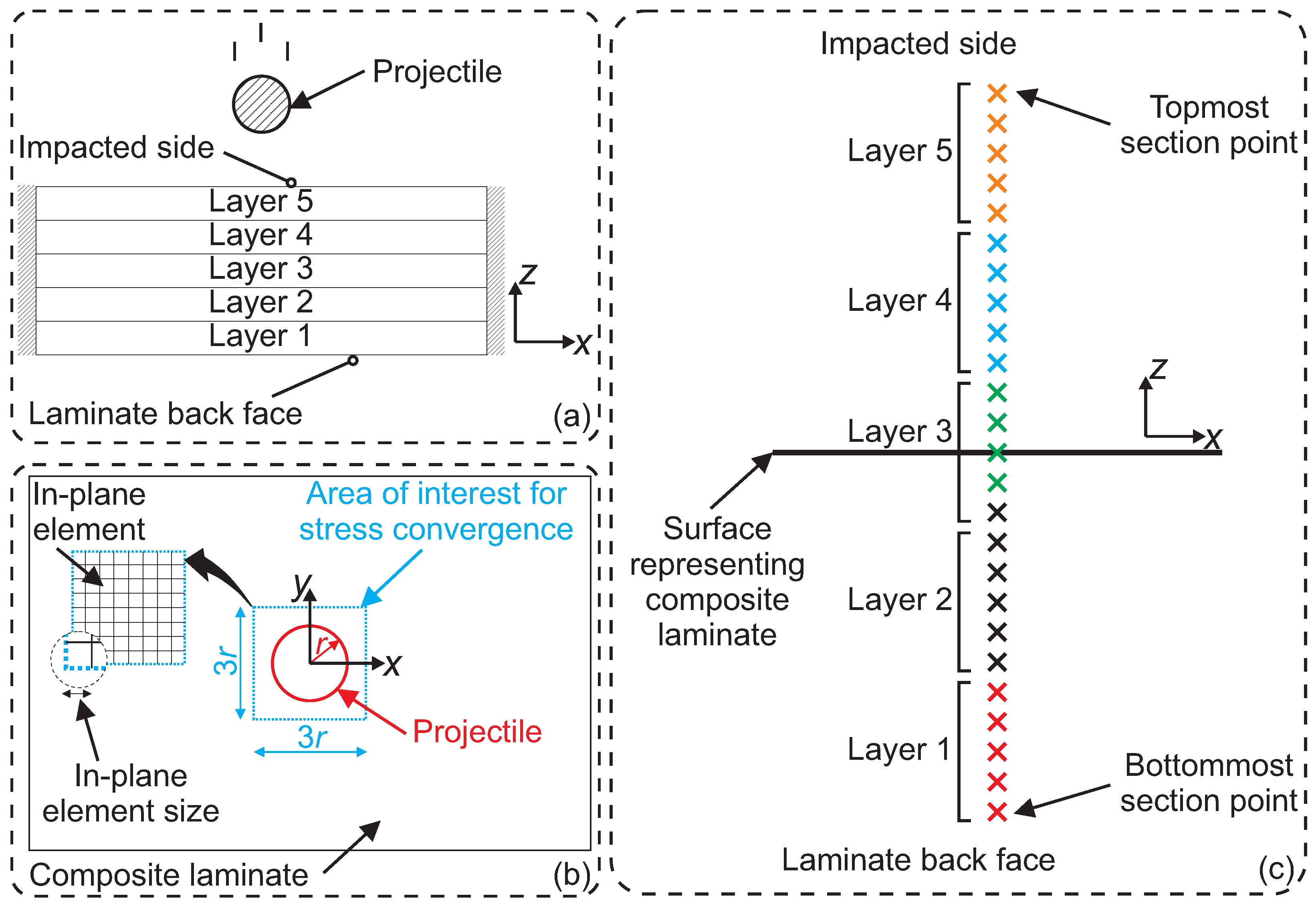 The novelty of this paper lies in presenting a comprehensive parametric study on LVI modeling of composite laminate using CSEs in Abaqus, with a focus on best practices and identifying their limitations. (I) A novel mesh convergence study is proposed that incorporates stress, in addition to the commonly used contact force and displacement, addressing the gap in the previous literature [30,47,58,64]. The proposed mesh convergence study further investigates the effect of the number of section points through the laminate thickness on the solution accuracy. This is particularly important because many widely used failure criteria for composites, such as Hashin [65,66], Puck [67,68], and LaRC [69,70], are stress-based. (II) The influence of different hourglass algorithms is assessed through the energy history plots to capture their cumulative effect on the solution accuracy. (III) Finally, we establish a thickness range within which CSEs can be reliably used for LVI modeling of composites. This paper is structured as follows: First, we present the key parameters and procedures in Section 2. This includes an explanation of the case studies included in this paper, the preprocessing parameters for FEA, and the proposed mesh convergence study, as well as the rationale for studying hourglass control and the applicable thickness range of CSEs. Section 3 discusses the FEA results. Finally, concluding remarks are provided in Section 4.