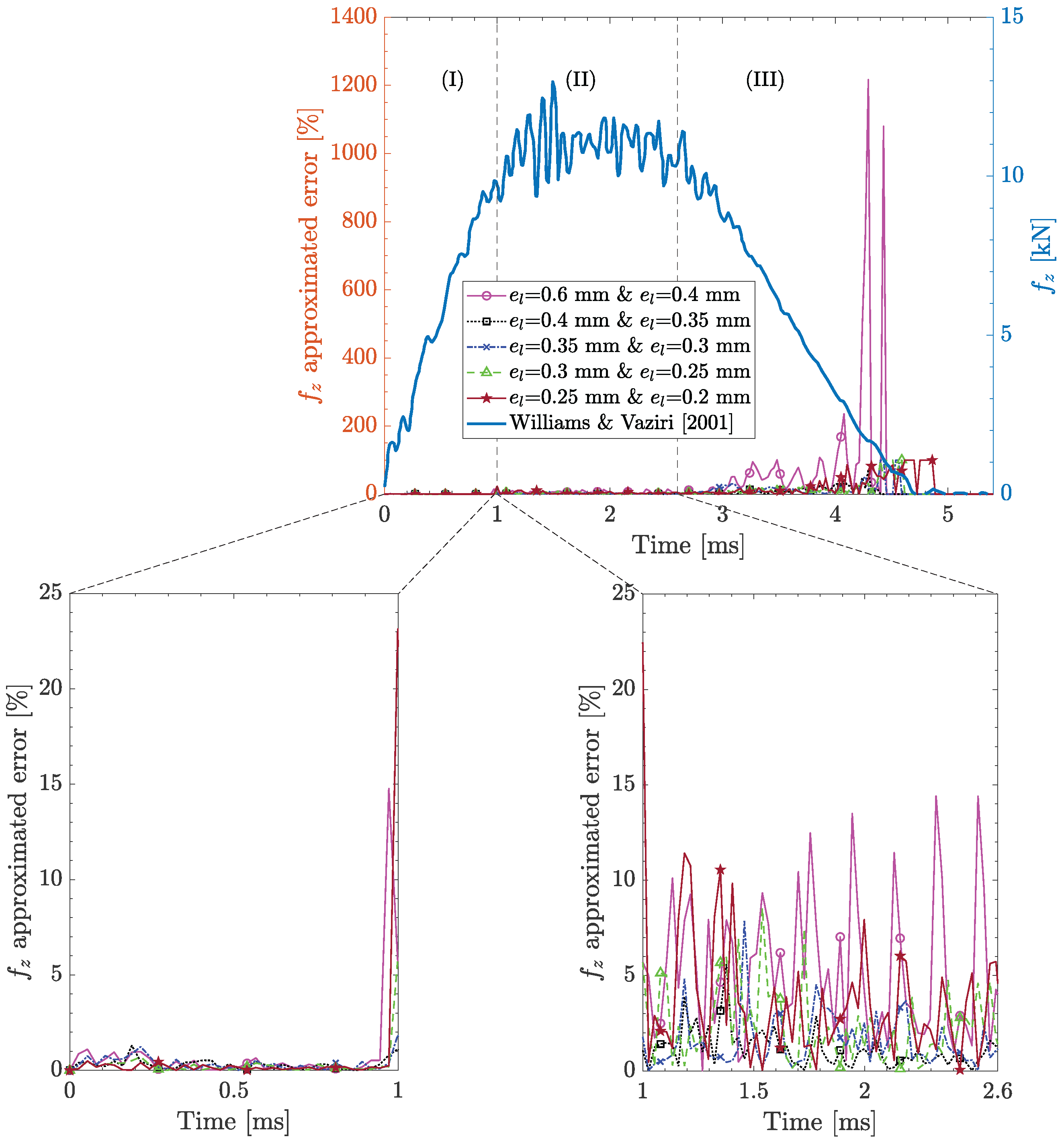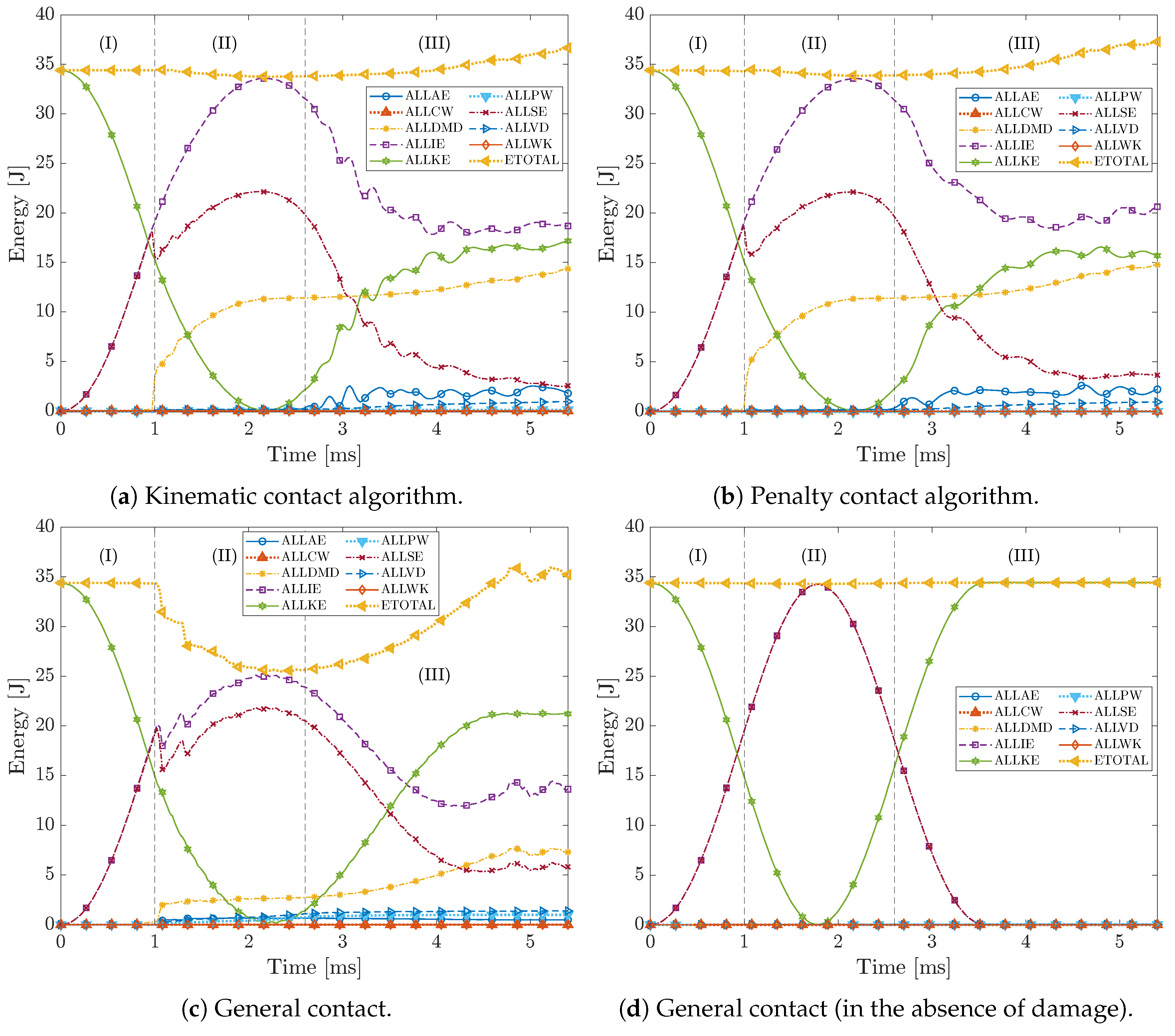 Table 6. Summary of compatible projectile modeling techniques and contact algorithms and interactions. Results correspond to case study #1 in Table 2 using an element size of 0.8 mm for all projectiles, an in-plane element size of 0.4 mm, five section points per layer for the composite laminate, and relax stiffness hourglass algorithm (✓: compatible, ×: incompatible, *: while effective in predicting contact force response, the general contact may lead to nonconservative response in energy history plots).