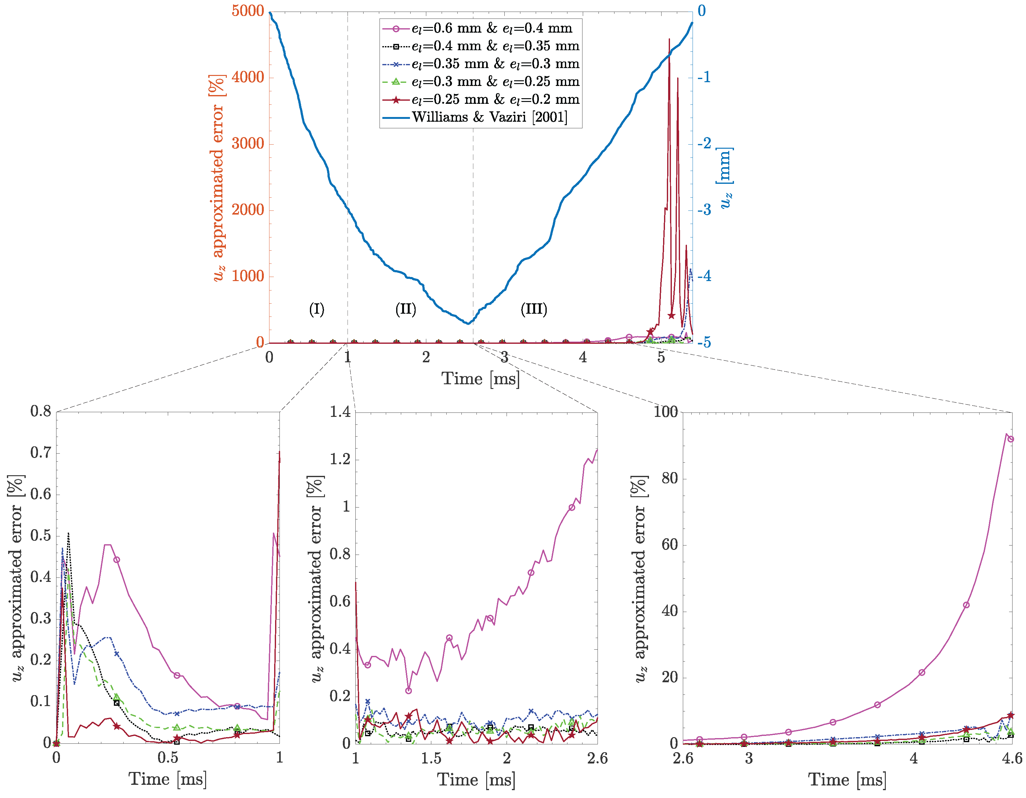 All FEAs are conducted using Abaqus/Explicit, which is well suited for highly nonlinear and transient problems, such as LVI [30]. Unlike the Abaqus/Implicit, Abaqus/Explicit does not perform an iterative convergence check at each time increment. Instead, it uses an explicit time integration scheme, enabling it to handle problems involving complex contact interactions with large deformations and material failure [57].