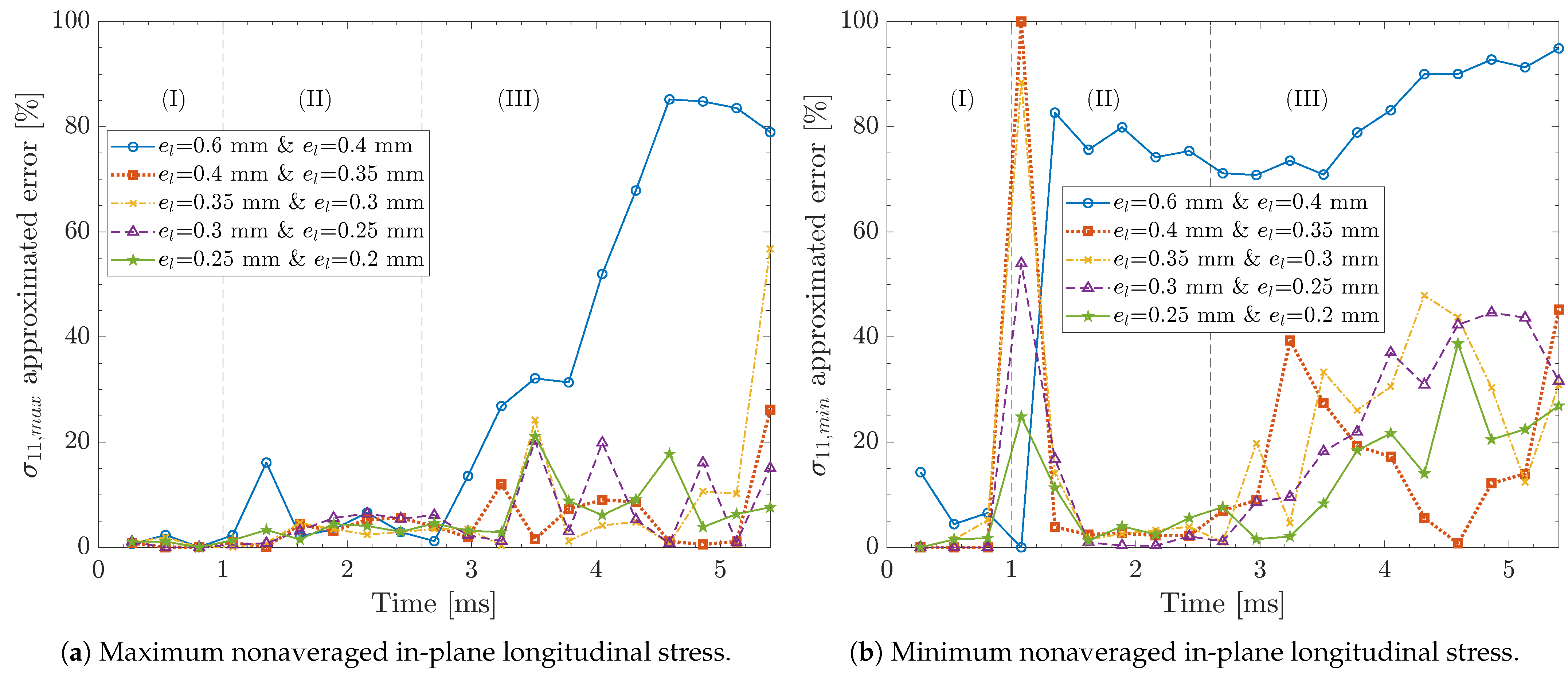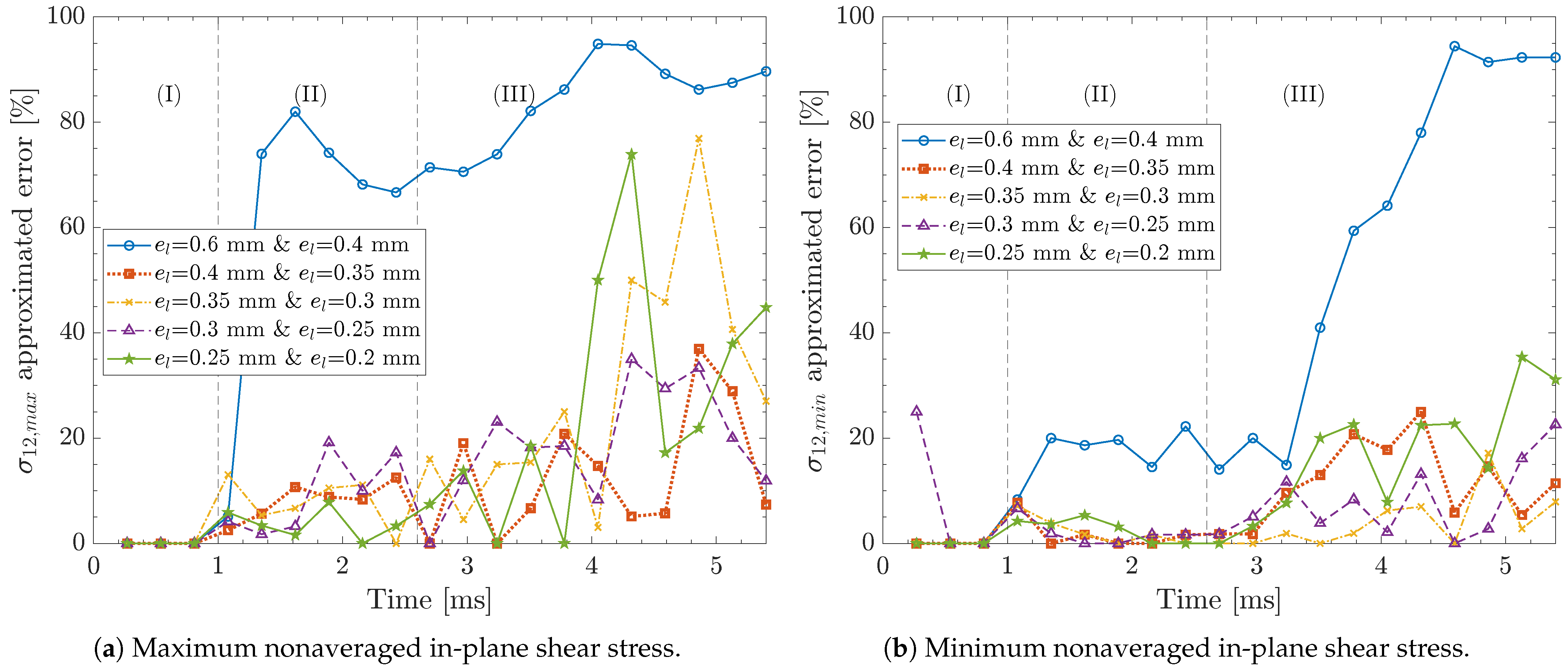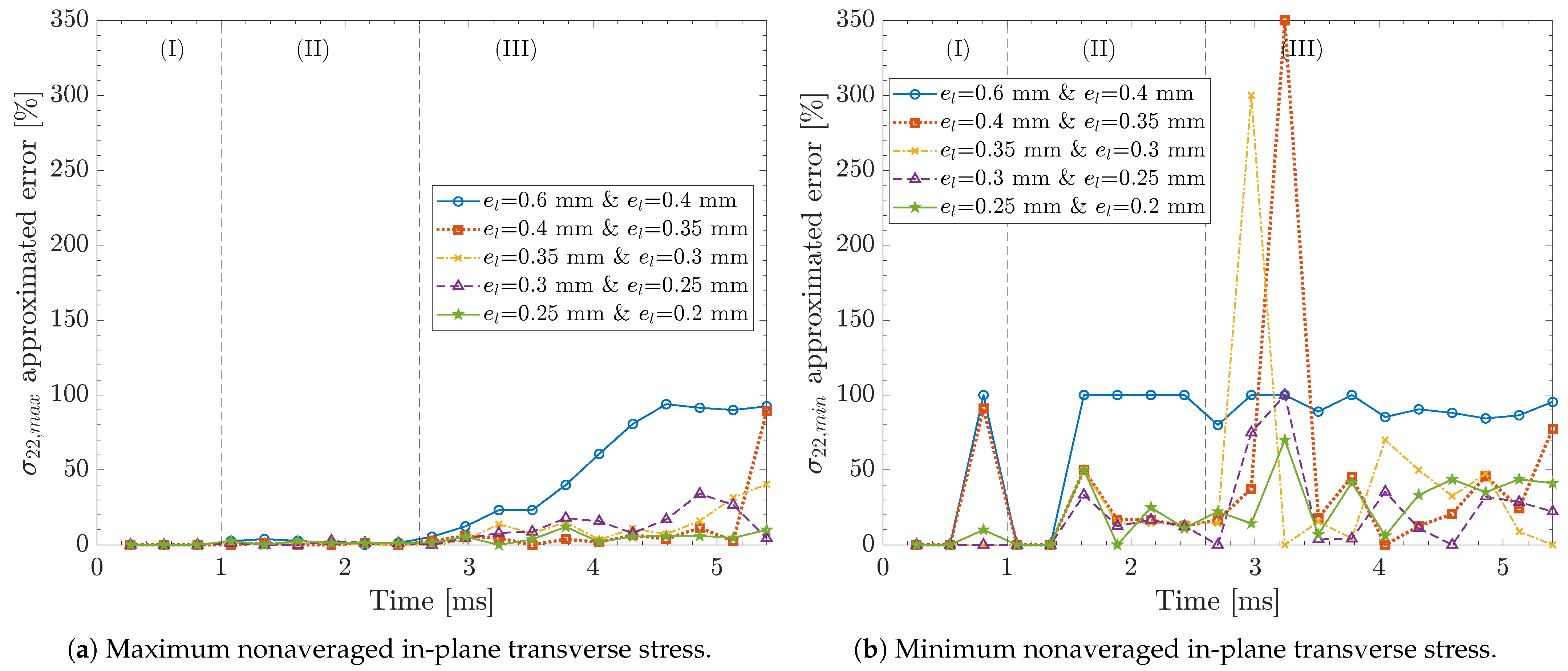 Low-fidelity models, such as layer-wise, rely on ad hoc assumptions from plate and shell theories. These models are efficient in capturing the overall structural response; however, they fall short in providing a detailed analysis of EAMs and stress prediction. In contrast, high-fidelity models, summarized in Table 1, are typically composed of solid and cohesive elements, providing detailed insights into EAMs and their interactions. However, these models are computationally expensive, and their complexity limits their practical application to large-scale composite structures and parametric studies. Bridging the gap between the low- and high-fidelity models, conventional shell elements (CSEs), such as S4R elements—a four-node quadrilateral CSE with reduced integration and a large-strain formulation—in the commercial code Abaqus, offer a balance between computational efficiency and acceptable accuracy [57]. CSEs use simplified geometry, have reduced degrees of freedom (DOF), and rely on section points through the thickness, avoiding the need for through-the-thickness discretizations. The use of section points enables CSEs to avoid the issue of small stable time increments associated with solid elements in explicit solvers [57]. Solid elements—with small through-thickness discretizations—and cohesive elements—due to their small thickness—govern the stable time increment, resulting in longer runtimes in explicit solvers. This is because the smallest element dimension governs the stable time increment in explicit solvers. These advantages make CSE attractive to parametric studies [58], submodeling [34], and cyclic load [59]. Furthermore, CSEs, combined with suitable damage models such as the Hashin failure criterion and cohesive elements, enables the prediction of intralaminar (matrix cracking and fiber breakage) and interlaminar (delamination) damage with reasonable accuracy [31]. A comprehensive review of various techniques for combined CSEs and cohesive elements in LVI modeling of composite laminates is provided in [32].