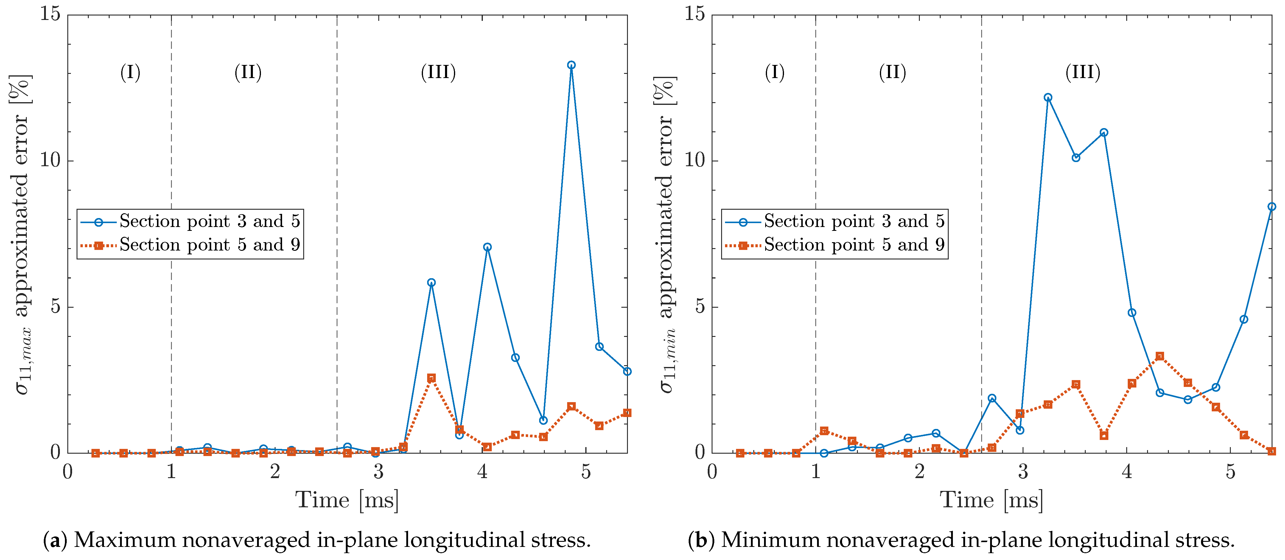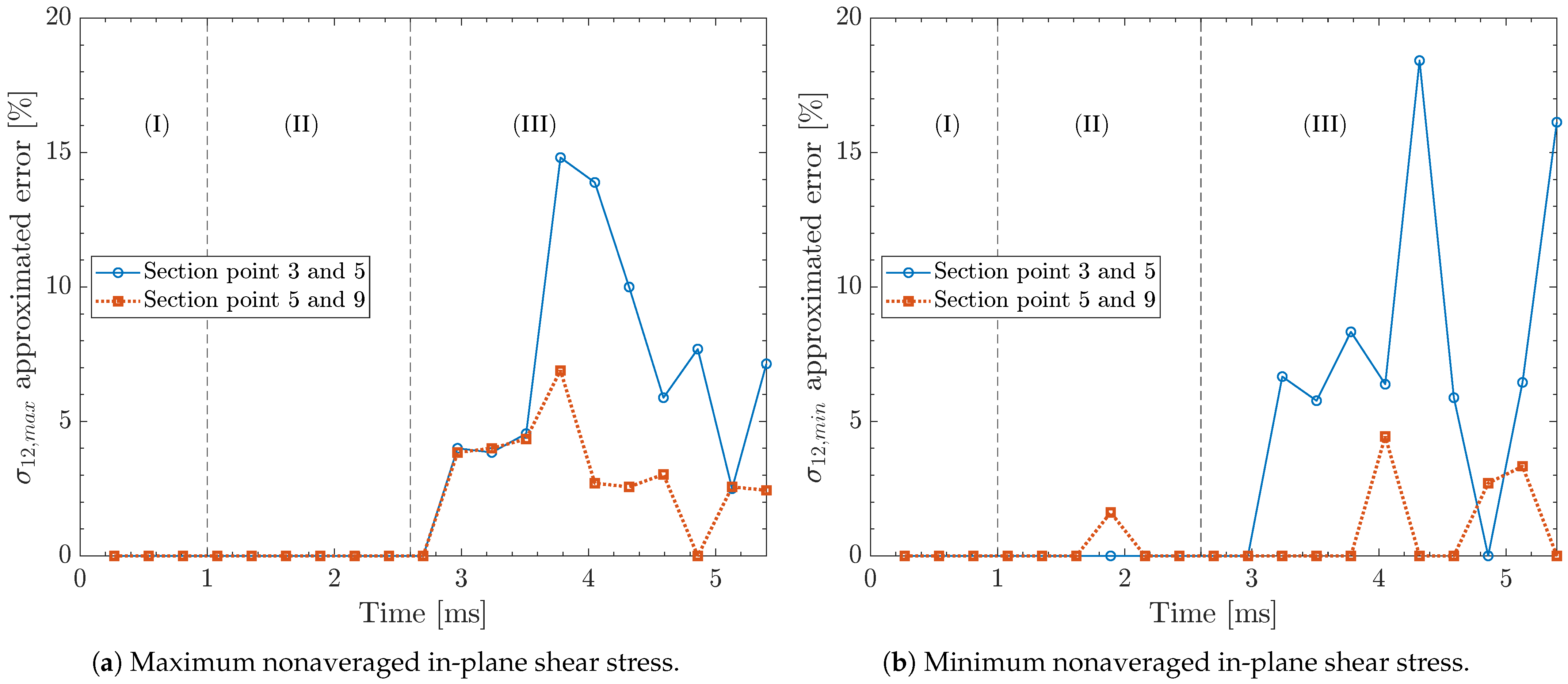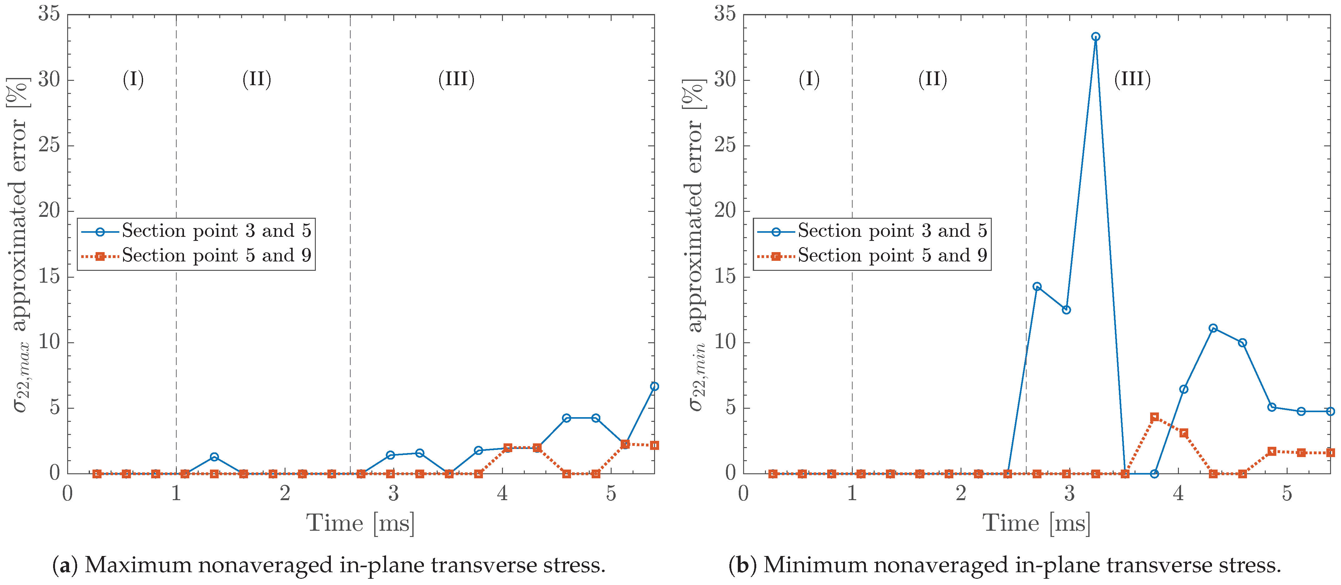 Low-fidelity models, such as layer-wise, rely on ad hoc assumptions from plate and shell theories. These models are efficient in capturing the overall structural response; however, they fall short in providing a detailed analysis of EAMs and stress prediction. In contrast, high-fidelity models, summarized in Table 1, are typically composed of solid and cohesive elements, providing detailed insights into EAMs and their interactions. However, these models are computationally expensive, and their complexity limits their practical application to large-scale composite structures and parametric studies. Bridging the gap between the low- and high-fidelity models, conventional shell elements (CSEs), such as S4R elements—a four-node quadrilateral CSE with reduced integration and a large-strain formulation—in the commercial code Abaqus, offer a balance between computational efficiency and acceptable accuracy [57]. CSEs use simplified geometry, have reduced degrees of freedom (DOF), and rely on section points through the thickness, avoiding the need for through-the-thickness discretizations. The use of section points enables CSEs to avoid the issue of small stable time increments associated with solid elements in explicit solvers [57]. Solid elements—with small through-thickness discretizations—and cohesive elements—due to their small thickness—govern the stable time increment, resulting in longer runtimes in explicit solvers. This is because the smallest element dimension governs the stable time increment in explicit solvers. These advantages make CSE attractive to parametric studies [58], submodeling [34], and cyclic load [59]. Furthermore, CSEs, combined with suitable damage models such as the Hashin failure criterion and cohesive elements, enables the prediction of intralaminar (matrix cracking and fiber breakage) and interlaminar (delamination) damage with reasonable accuracy [31]. A comprehensive review of various techniques for combined CSEs and cohesive elements in LVI modeling of composite laminates is provided in [32].