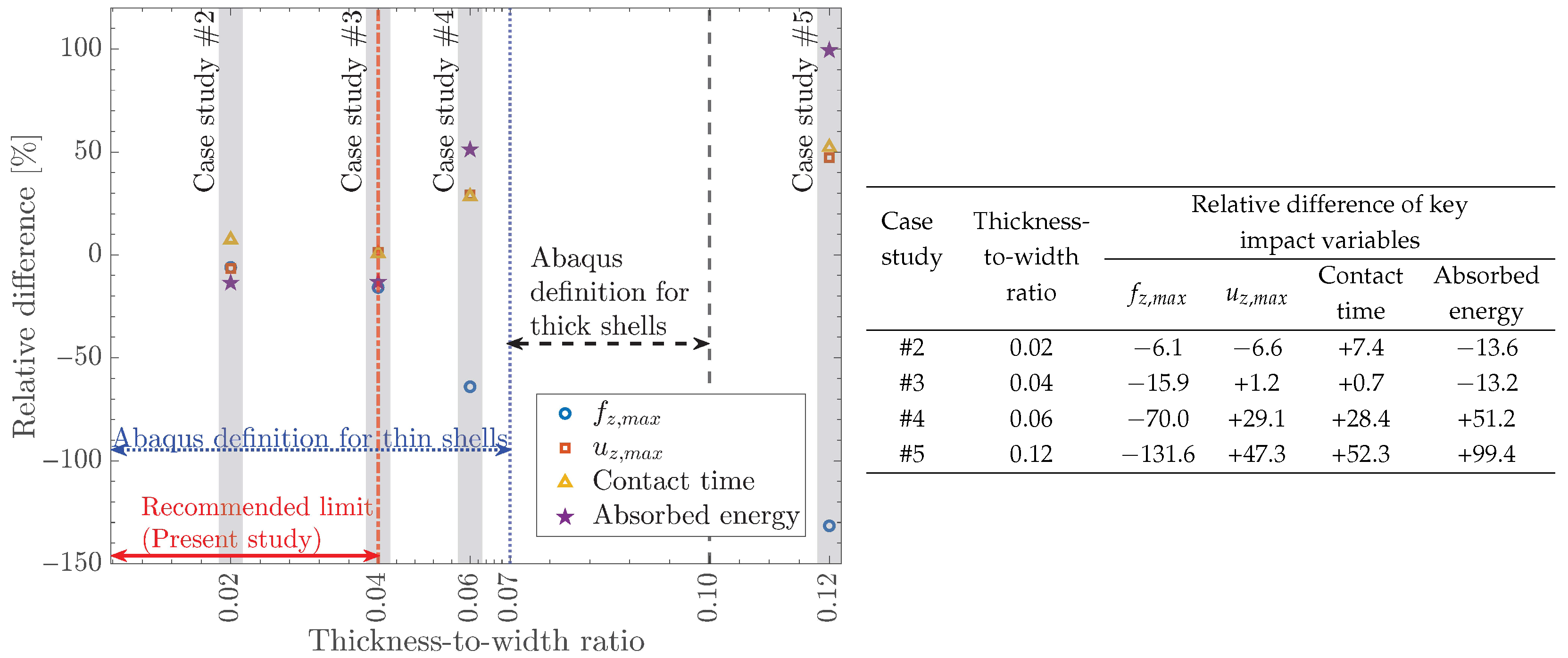 This paper focuses on LVI modeling of composite laminates using the S4R element unique to Abaqus. The S4R element enforces the first-order shear deformation theory (FSDT) and is suitable for applications where transverse shear deformations are nonnegligible, such as impact [57]. This paper is limited to nonrepeated, hard-body impact (i.e., drop-weight impact test) at velocities less than 10 m/s. The oblique impact often leads to shear-driven delamination [71] and sliding at the contact interface [72], which requires a separate parametric study to account for the different impact angles. While such analyses are of great practical relevance, the normal impact is considered the most serious impact event on the composite structures [72]. Therefore, this paper is limited to normal impact events, where the projectile impacts the laminate at an angle of 90° (normal to the laminate surface, along the laminate thickness direction). Although interlaminar damage (i.e., delamination) is a frequent failure mechanism in composite laminates during LVI, this paper only considers intralaminar damage (i.e., fiber and matrix failure). The constitutive damage model is based on the Hashin failure criterion and continuum damage model (CDM) in Abaqus. Assumptions and limitations of these damage models are discussed in Appendix B. Despite using the Hashin failure criterion, we do not quantify the damage initiation and evolution. Instead, we focus on the overall laminate response and convergence study. The proprietary nature of Abaqus limits the depth of the mathematical explanation, with the interpretation focusing on qualitative observations rather than fundamental algorithmic details. While the methodology and procedures are general, results may vary depending on impact velocity, projectile shape and mass, laminate stacking sequence, geometry, constituent materials, and environmental conditions. Furthermore, all the analyses in this paper are conducted at the coupon scale. While the findings provide valuable insight into the accuracy and limitations of CSEs, the scale-up from coupon level to structural scale may require additional numerical verification and experimental validation. The conclusions and best practices presented in this paper are based on the surveyed literature provided in Table 2, and the scope limitations should be considered when interpreting the results. Overall, this paper establishes a benchmark for the LVI modeling of composite laminates using CSEs in Abaqus, highlighting both the best practices and limitations, and providing guidelines for future research. Furthermore, the Abaqus files developed in this paper are publicly available on GitHub.
