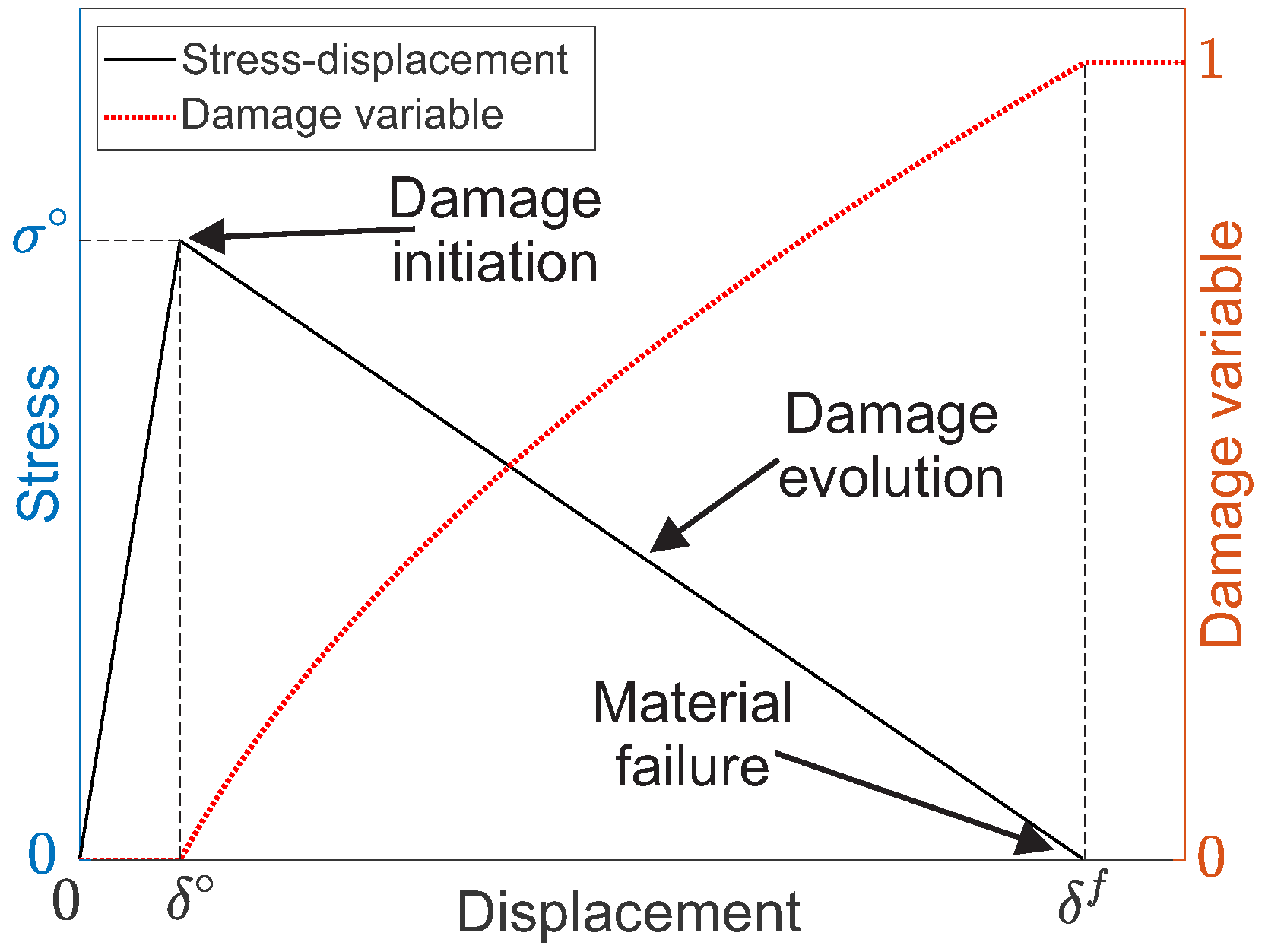 Damage initiation is governed by the Hashin failure criterion [65], and damage evolution follows CDM proposed in [82]. This damage model only captures intralaminar damage, i.e., damage to the fiber and matrix within layers and does not account for interlaminar damage, i.e., delamination. To avoid numerical instabilities during damage evolution, a maximum degradation level of 0.98 is applied, meaning that the elements are deleted once their stiffness reaches 0.2% of the undamaged state. This damage model is discussed in detail in Appendix B.