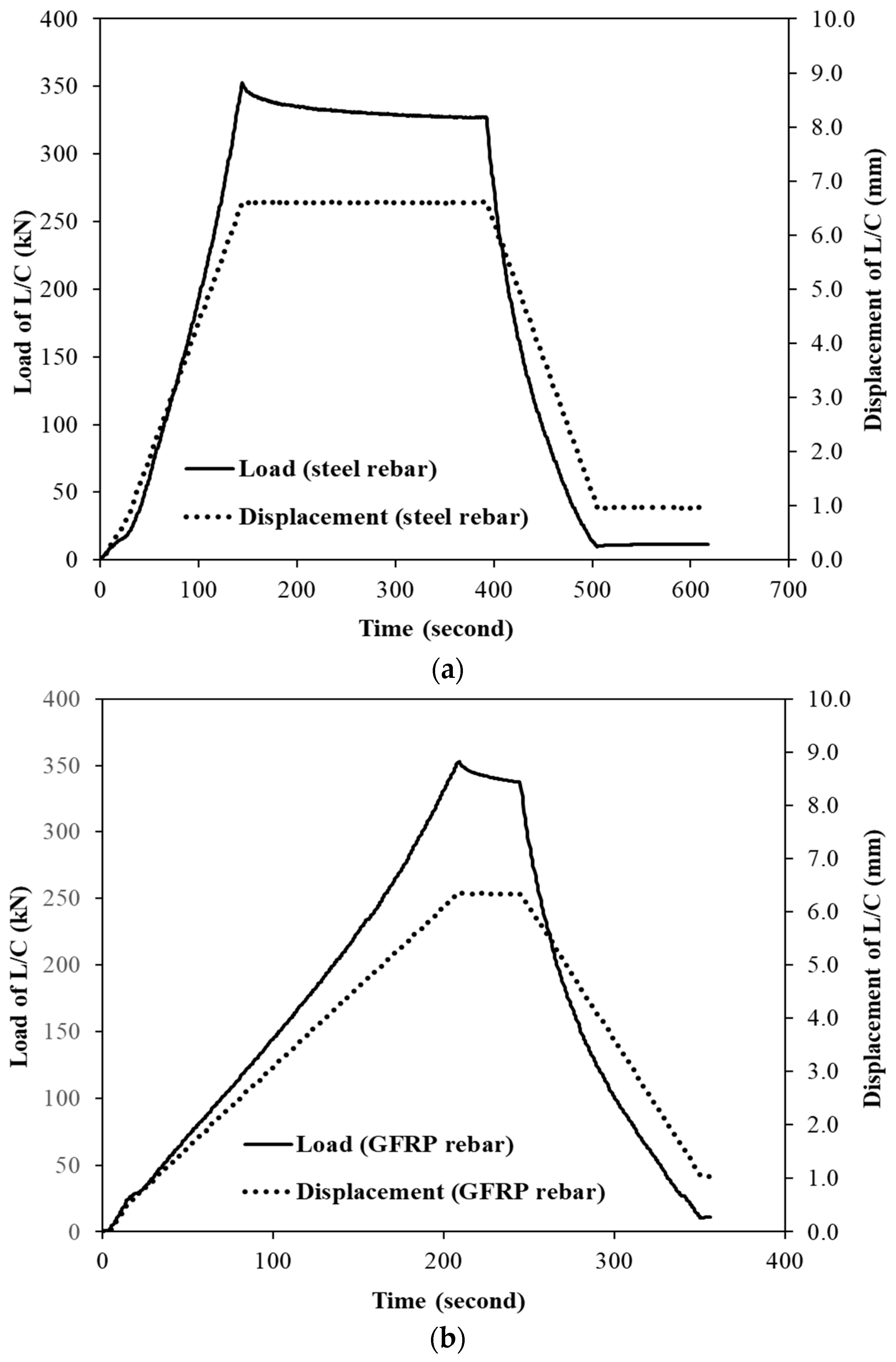 - Both steel- and GFRP-reinforced specimens exhibited a typical nonlinear response characterized by a gradual load increase, plateau, and unloading phase. The steel-reinforced specimen showed slightly higher load capacity and a longer plateau, indicating ductile yielding, whereas the GFRP-reinforced specimen displayed a steeper load–displacement path and faster unloading, consistent with its linear–elastic and brittle characteristics. Under identical displacement levels, the GFRP specimen exhibited higher stiffness and load-carrying capacity, while the steel specimen showed slightly larger residual deformation due to its ductile nature.