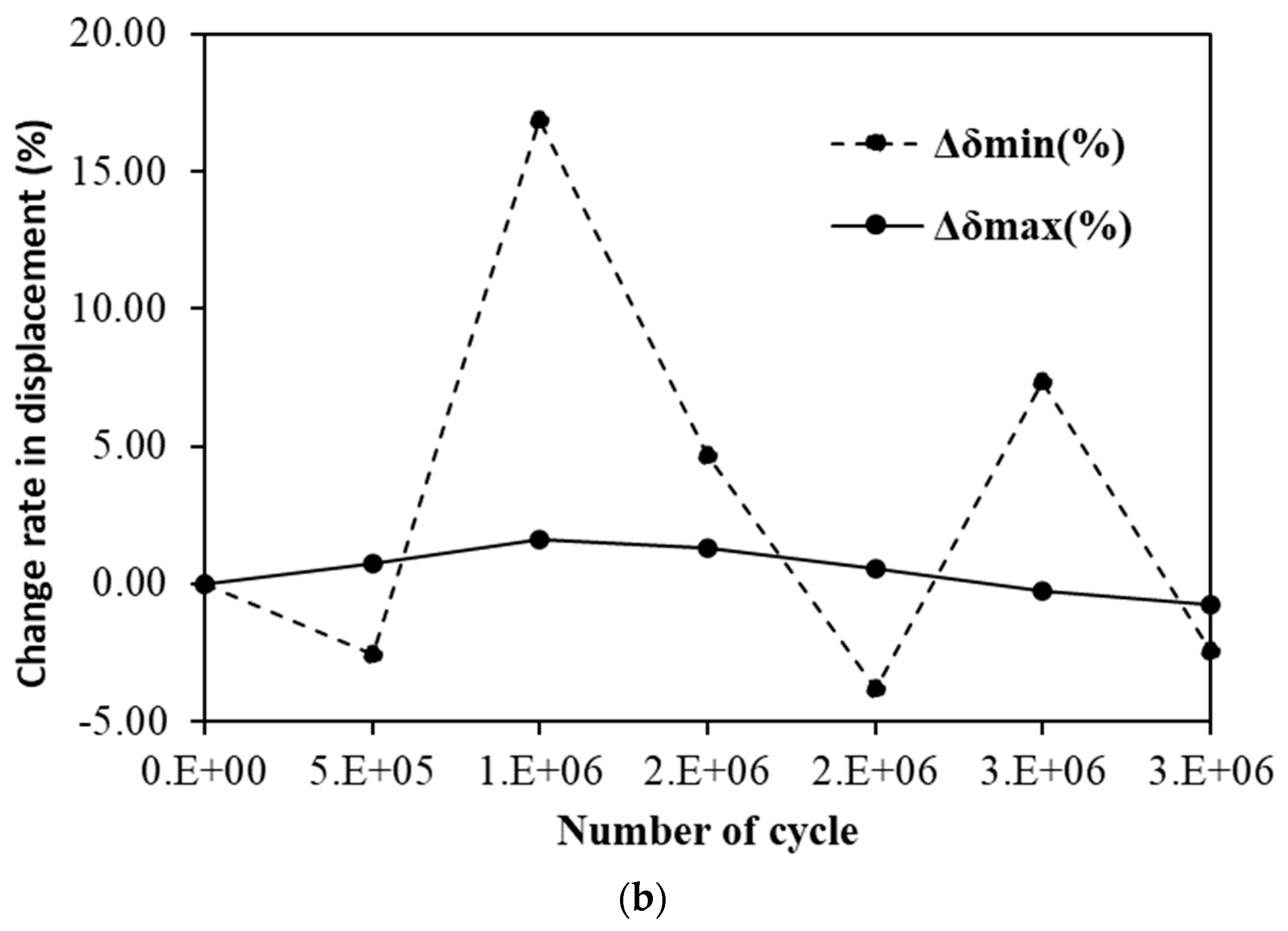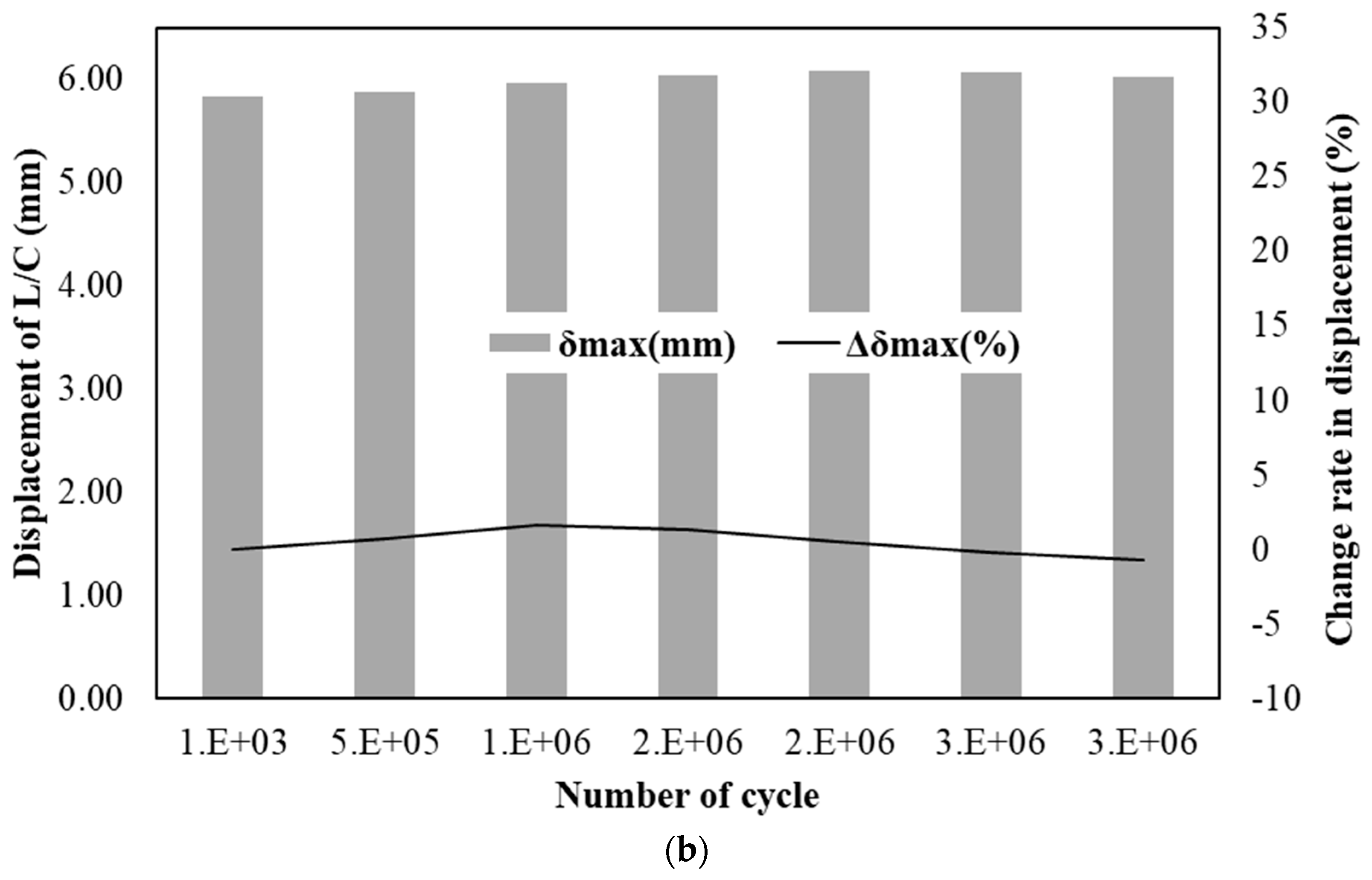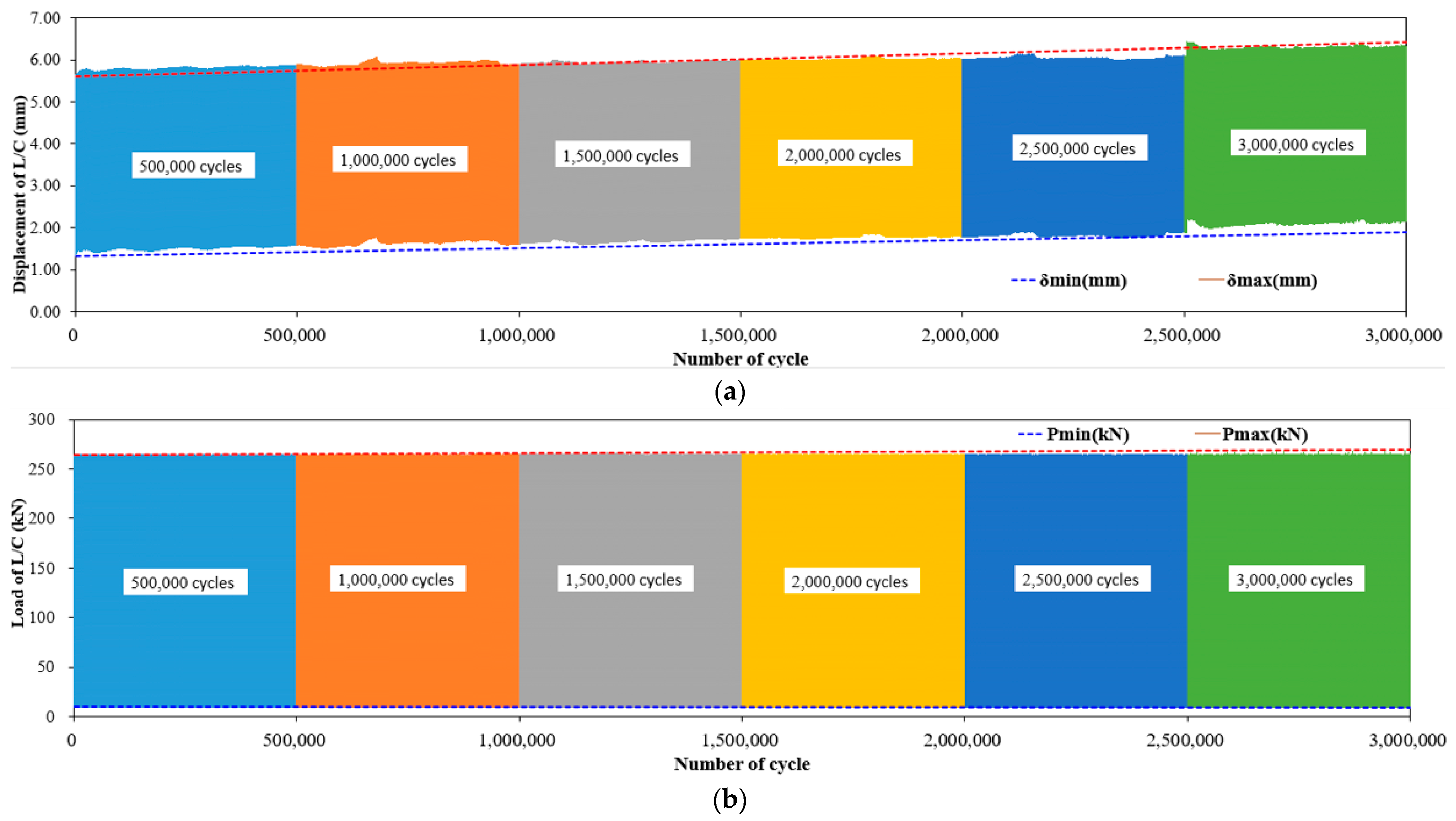 - For both materials, displacement variations during cyclic loading remained within 1 mm, and load variations were within 10 kN, indicating excellent stability under accumulated fatigue cycles. The fluctuation in displacement change rates decreased as the number of cycles increased, implying stabilization of internal stresses. The steel-reinforced specimen maintained stable deformation behavior without progressive displacement growth up to three million cycles. Similarly, the GFRP-reinforced specimen exhibited only minor elastic adjustments with no signs of stiffness degradation, confirming superior fatigue resistance.