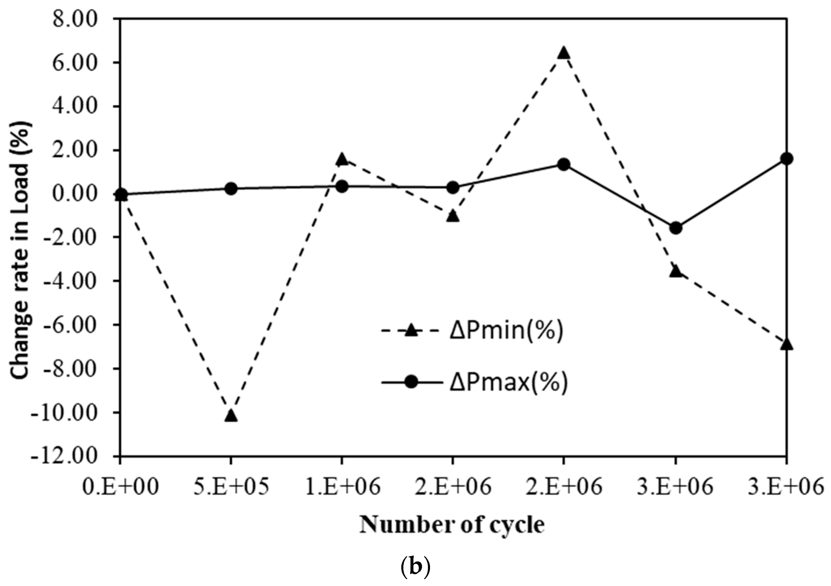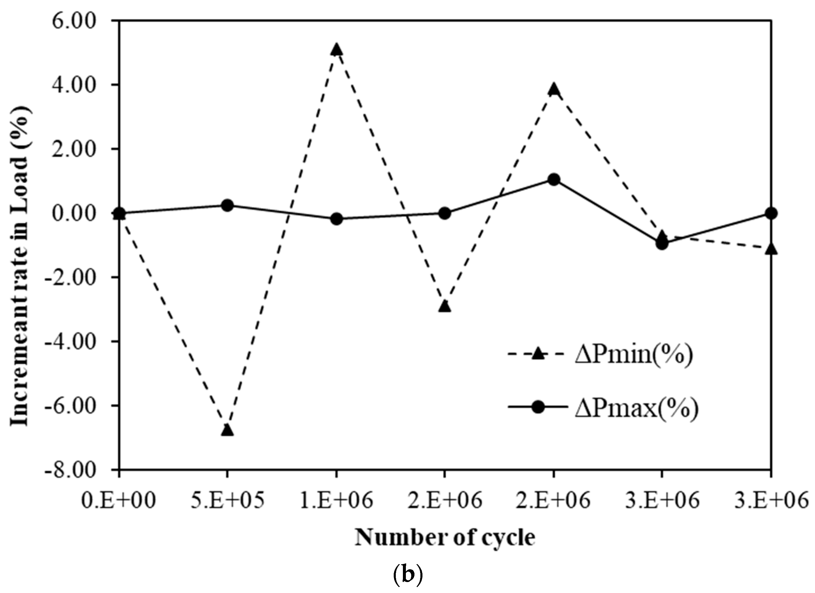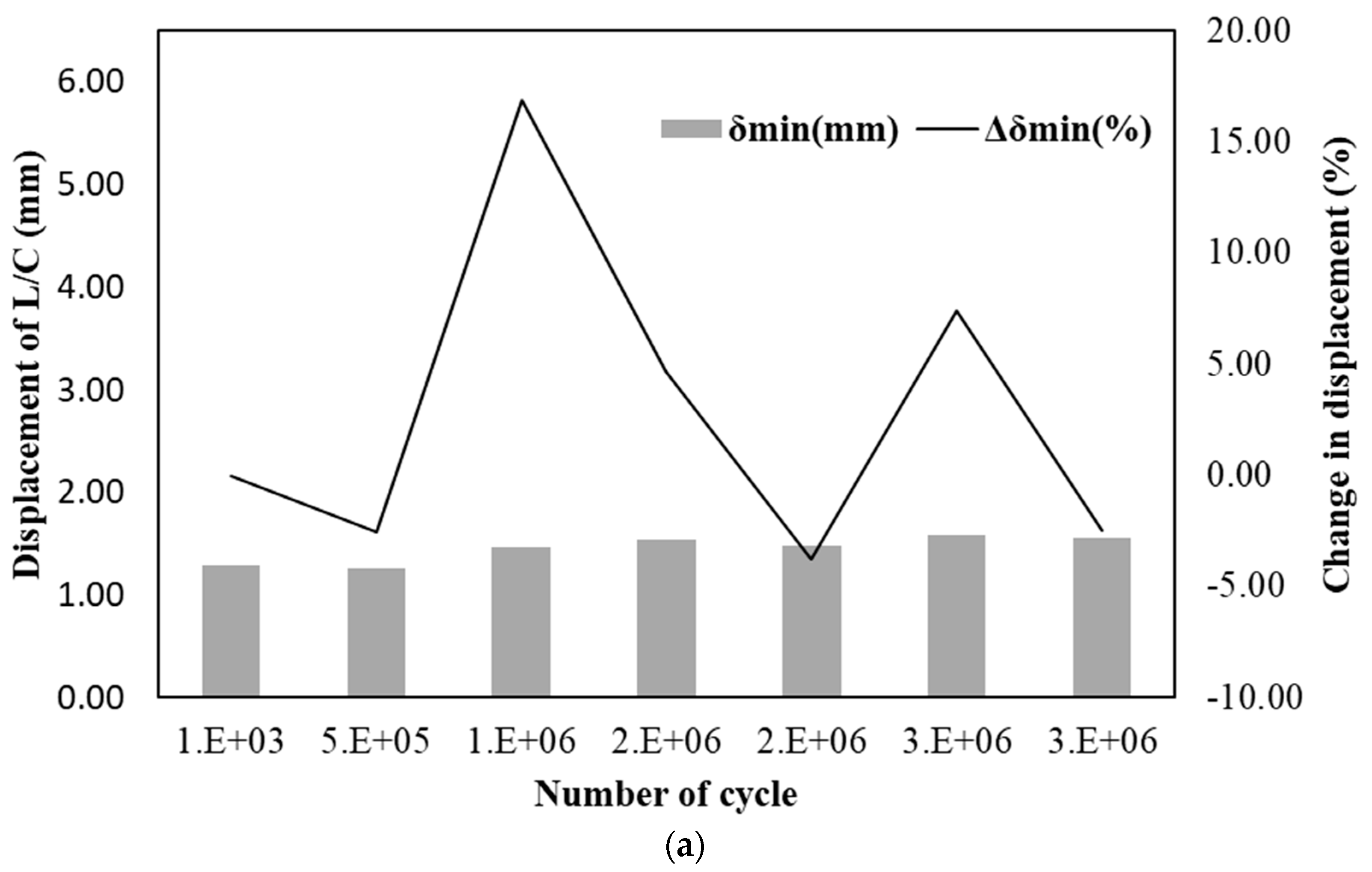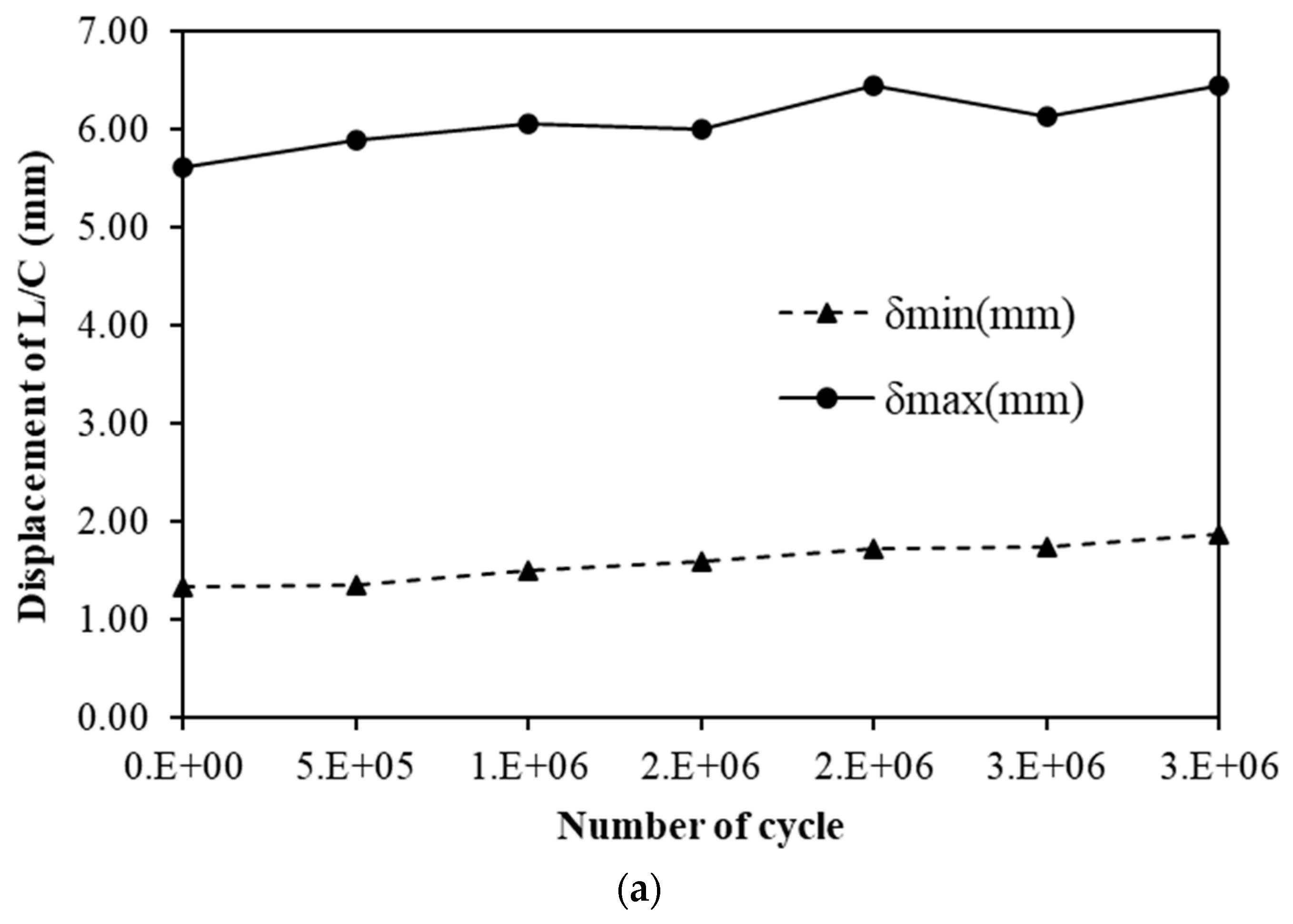 - For both materials, displacement variations during cyclic loading remained within 1 mm, and load variations were within 10 kN, indicating excellent stability under accumulated fatigue cycles. The fluctuation in displacement change rates decreased as the number of cycles increased, implying stabilization of internal stresses. The steel-reinforced specimen maintained stable deformation behavior without progressive displacement growth up to three million cycles. Similarly, the GFRP-reinforced specimen exhibited only minor elastic adjustments with no signs of stiffness degradation, confirming superior fatigue resistance.