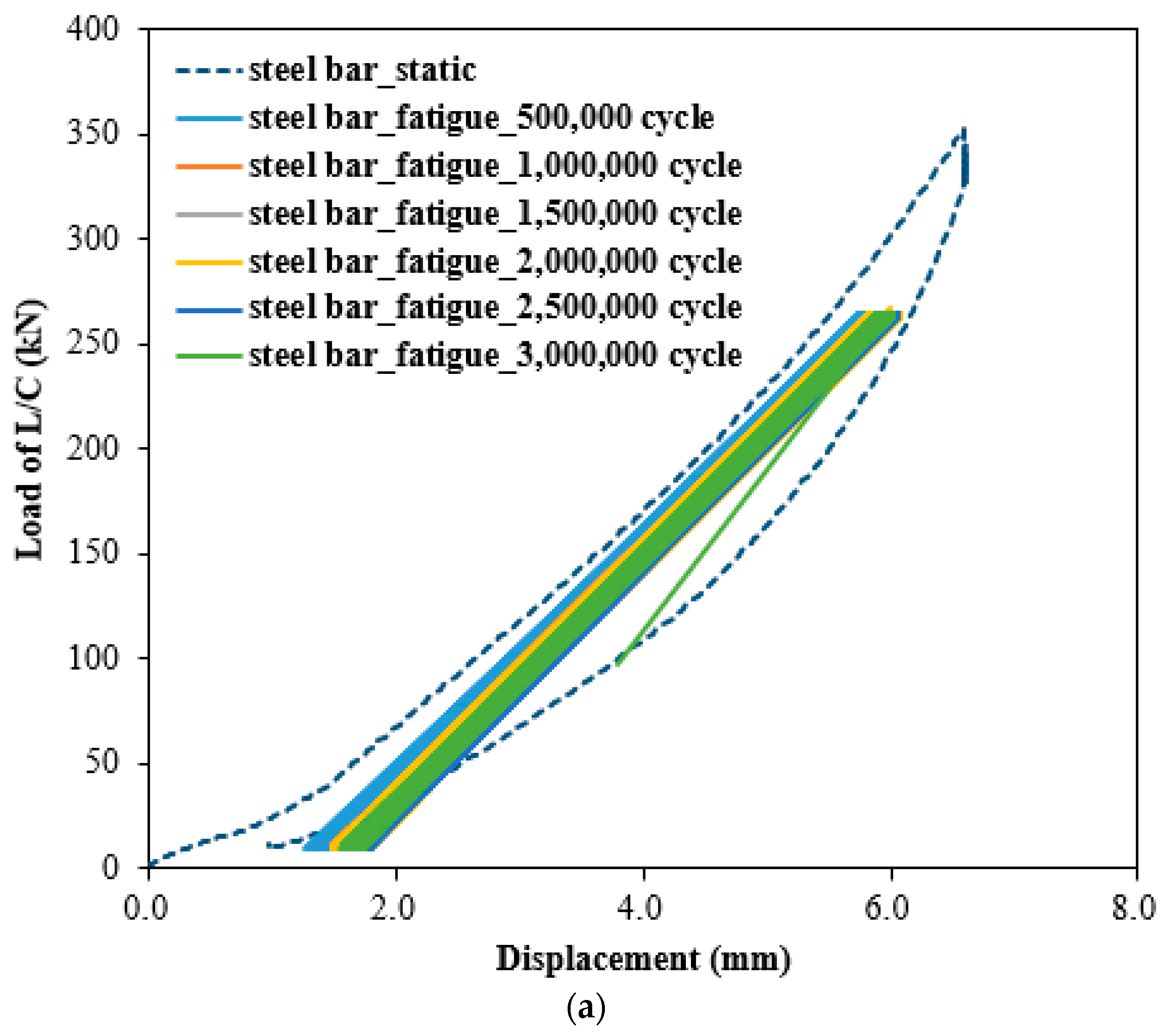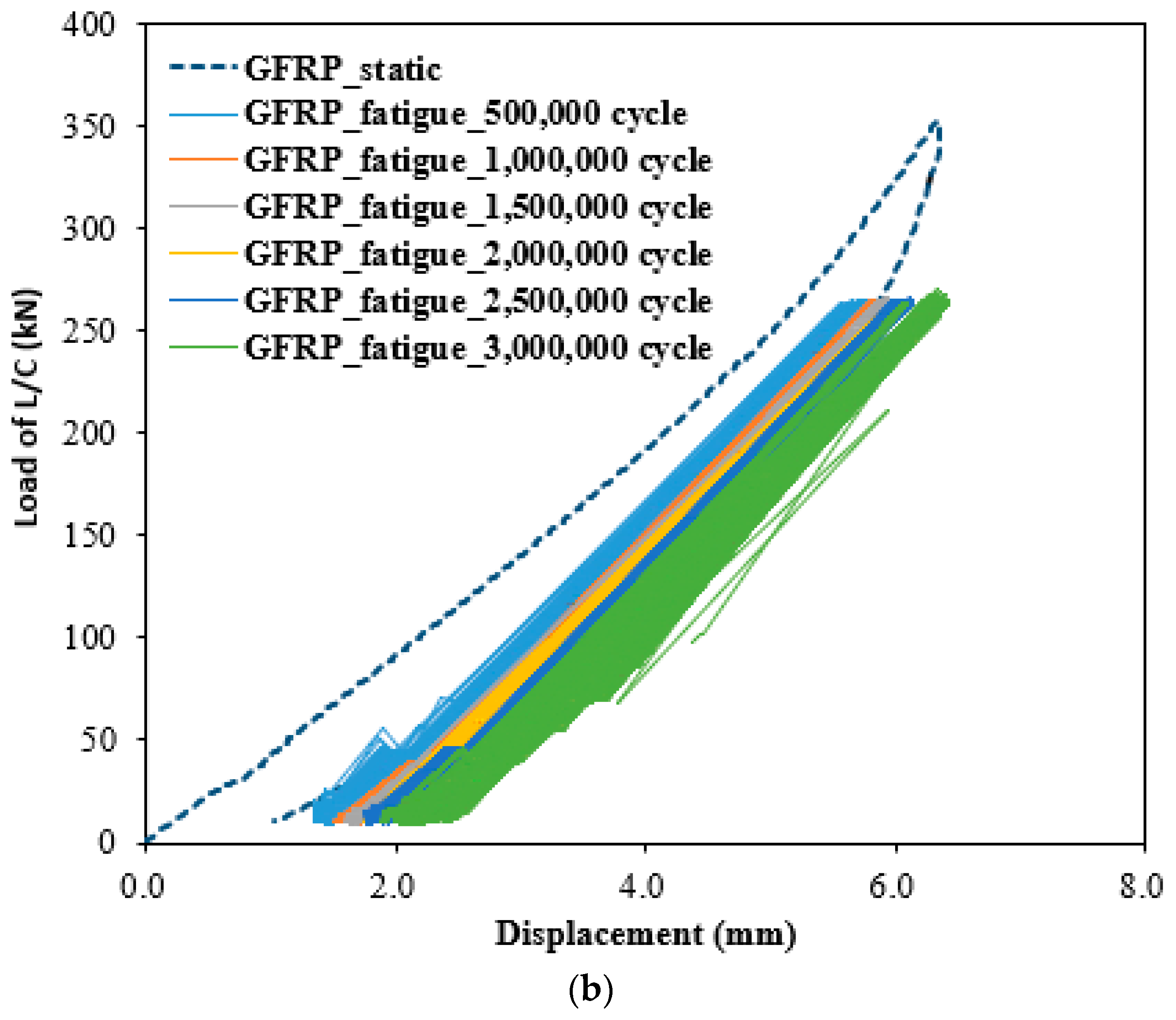 - Both steel- and GFRP-reinforced slabs maintained nearly identical load–displacement relationships across 1 to 3 million loading cycles, closely following the static curve. Displacement increased slightly with loading cycles; however, the total variation remained below 1 mm, signifying negligible deformation accumulation. The minimal change in load cell displacement and load with cycle accumulation indicates that dynamic structural stability and long-term serviceability can be effectively maintained under repeated loading. These findings verify that both reinforcement types provide sufficient stiffness retention and fatigue durability over extended service life.