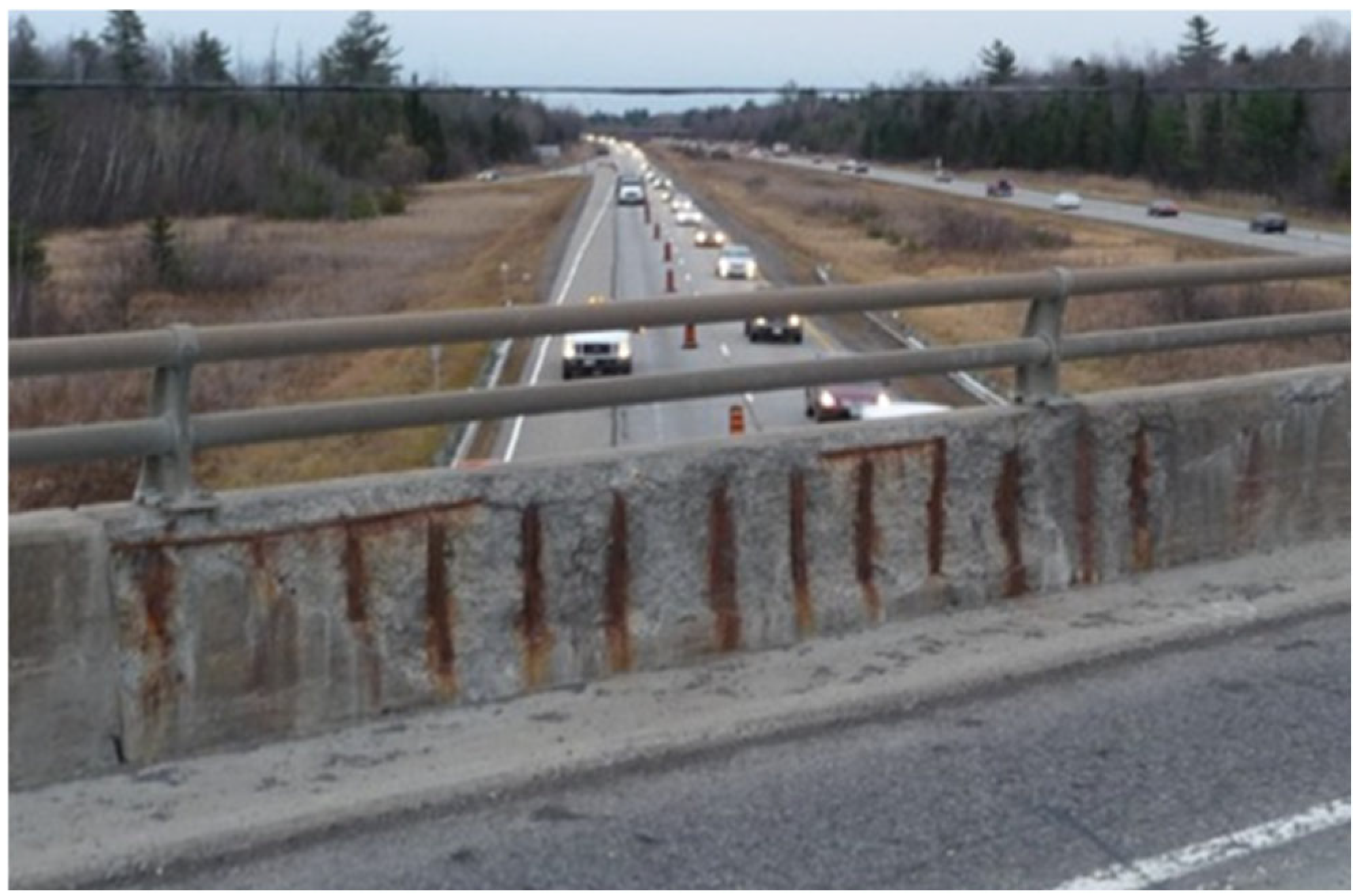 The corrosion of steel reinforcement due to environmental influences significantly contributes to the degradation of bridge barriers. Utilizing glass fiber-reinforced polymer (GFRP) bars for reinforcing bridge construction presents an effective solution because of their corrosion resistance, which leads to a lower environmental impact. GFRP bars can act as a substitute for conventional steel reinforcement in bridge structures, especially when subjected to severe environmental conditions [1,2,3,4]. In winter, the application of de-icing salt poses a considerable threat to the exposed elements of bridges. It is believed that steel-reinforced barrier walls are negatively impacted by such environmental factors, resulting in the development of cracks on the barrier surface that permit salt solutions to penetrate the barrier wall. Once these solutions reach the reinforcing steel bars, they trigger corrosion, which ultimately reduces the overall strength of the barrier. This decrease in strength may jeopardize the structural integrity of the barrier during vehicle collisions, potentially leading to barrier failure [5,6,7]. Figure 1 depicts a photograph of a deteriorated barrier wall that has experienced corrosion of the steel-reinforcing bars.