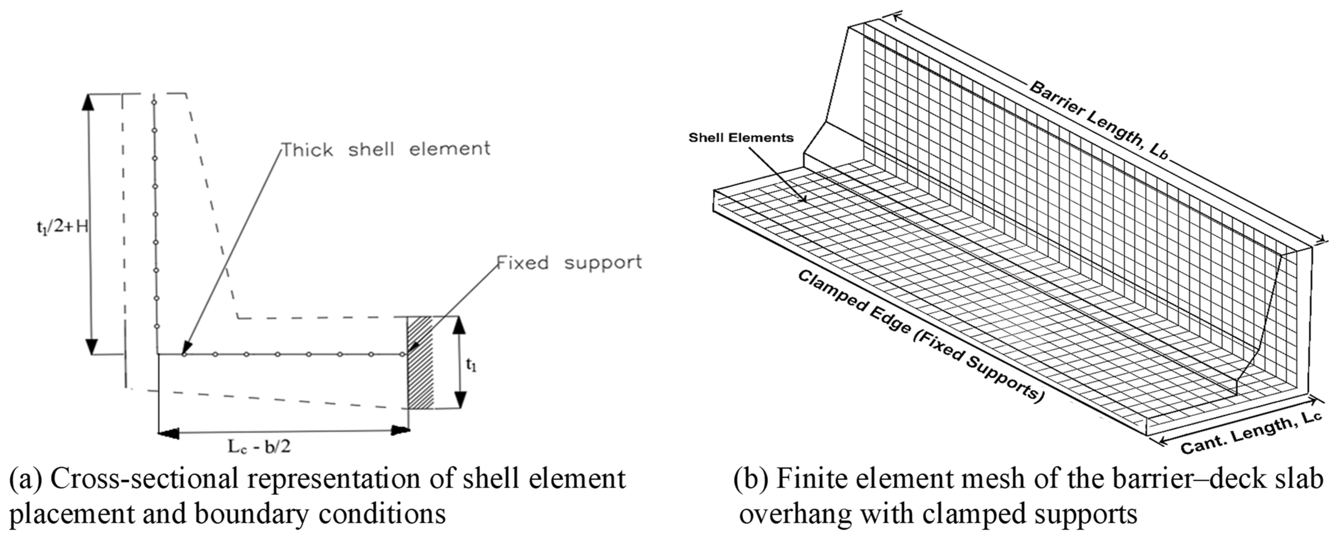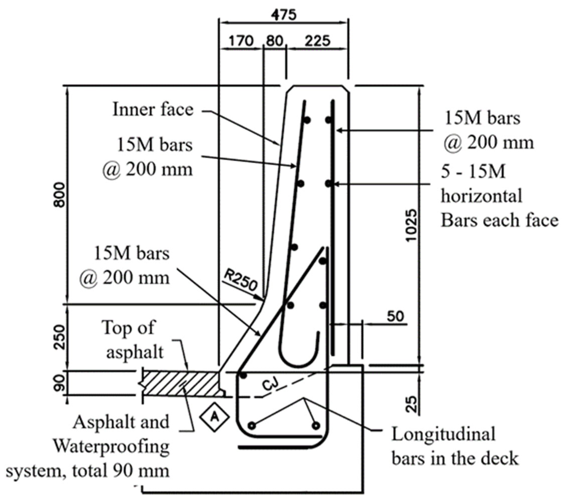 The design of a TL-5 traffic barrier supported on a bridge deck overhang requires accurate assessment of the transverse impact load effects on the barrier–deck system. In this study, the investigated configuration consists of a barrier mounted on a deck slab with an overhang length of 0.7 m, a total barrier length of 20 m, and a deck thickness of 250 mm, with barrier dimensioning as shown in Figure 2.