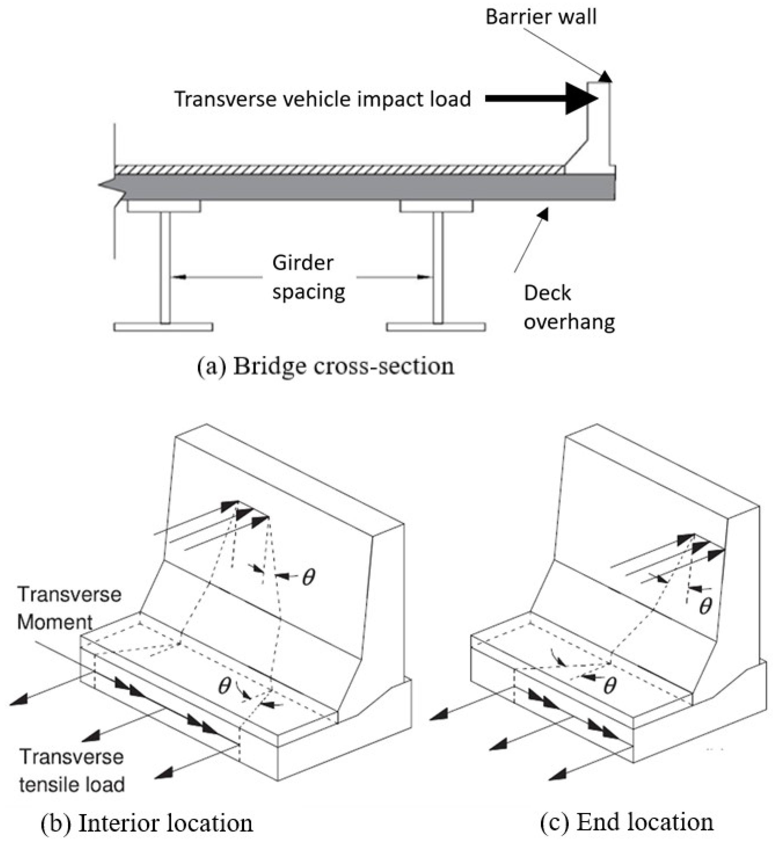 The design traffic loads and geometric requirements for bridge concrete barrier walls and deck overhangs are based on the Canadian Highway Bridge Design Code [25] and AASHTO-LRFD bridge design specification [26]. This is in addition to the AASHTO guide for selecting, locating, and designing traffic barriers [27] and the AASHTO guide specification for bridge railings [28]. The preliminary configuration of the TL-5 precast bridge barrier was developed in accordance with the CHBDC requirements [25] for static loading at the connection between the deck slab and the barrier wall [29]. According to CHBDC provisions, longitudinal and vertical loads of 210, 70, and 90 kN, respectively, must be considered over a defined segment of the barrier. For TL-5 barriers, the code specifies that the transverse load is to be distributed along a 2400 mm length. To determine the factored design loads, a live load factor of 1.7 is applied to the nominal loads specified earlier. As the transverse load governs the critical capacity of the barrier system, the longitudinal and vertical components were excluded from the design considerations for both the reinforcement of the barrier wall and its anchorage to the deck slab. In accordance with CHBDC, the prescribed live load factor is 1.7. Consequently, the resulting design transverse load acting over a 2400 mm barrier length is 357 kN, which was used in sizing the vertical and horizontal reinforcement within the barrier wall. Figure 3 presents how the transverse impact loading is applied at the barrier interior and end locations and how this load is transferred through the barrier wall and the deck overhang through the differential angles.