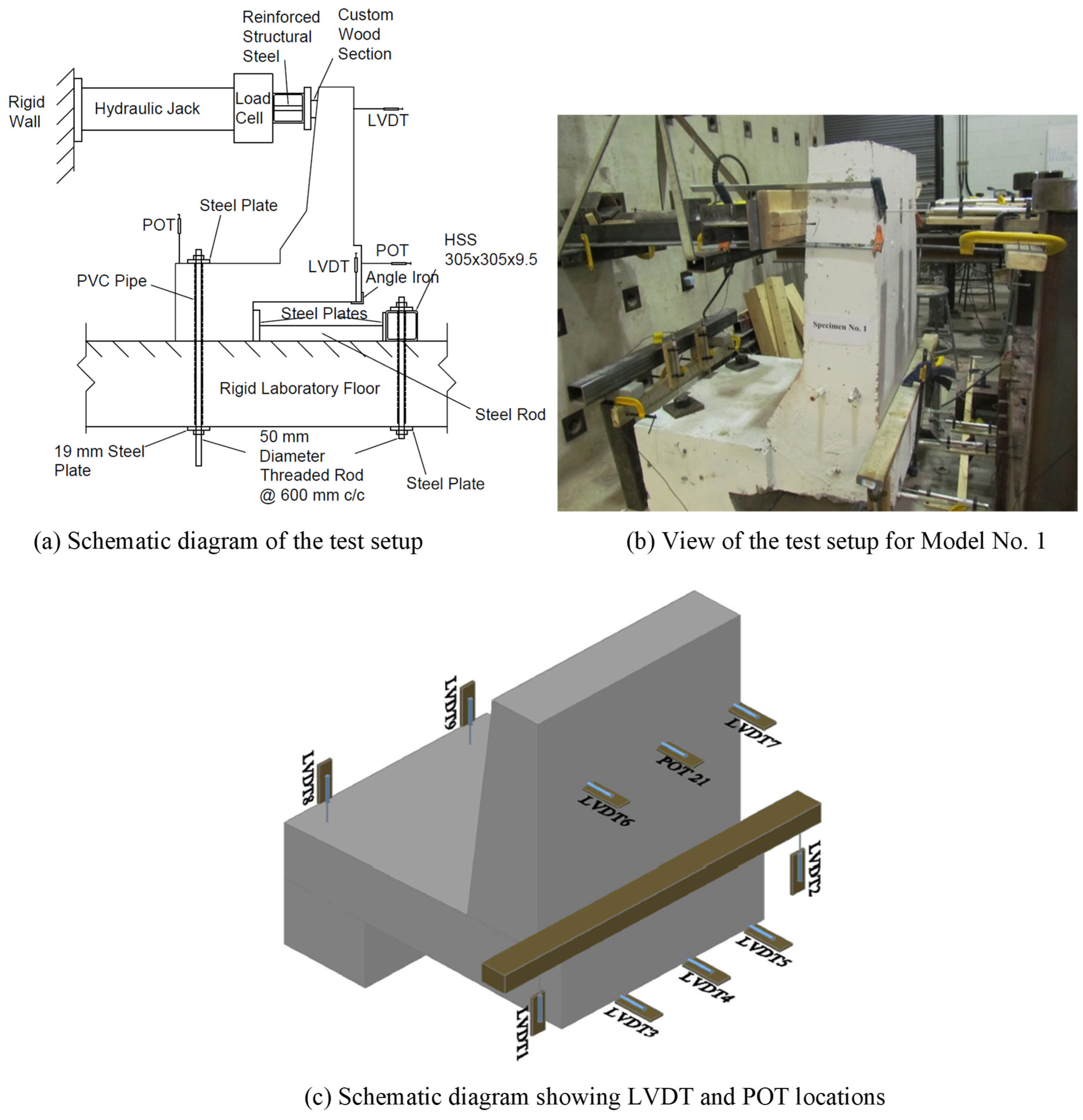 Figure 8 presents schematic representations of the test setup, including the locations of the LVDTs. Each barrier model was mounted on the strong floor of the structural laboratory and anchored using 50 mm diameter threaded rods at 600 mm intervals, which were tightened to control slab uplift during testing. A hydraulic jack applied horizontal loads to the barrier walls, while a universal flat load cell with a 900 kN capacity recorded the applied forces. Data from all sensors were collected using a SYSTEM 6000 data acquisition unit.