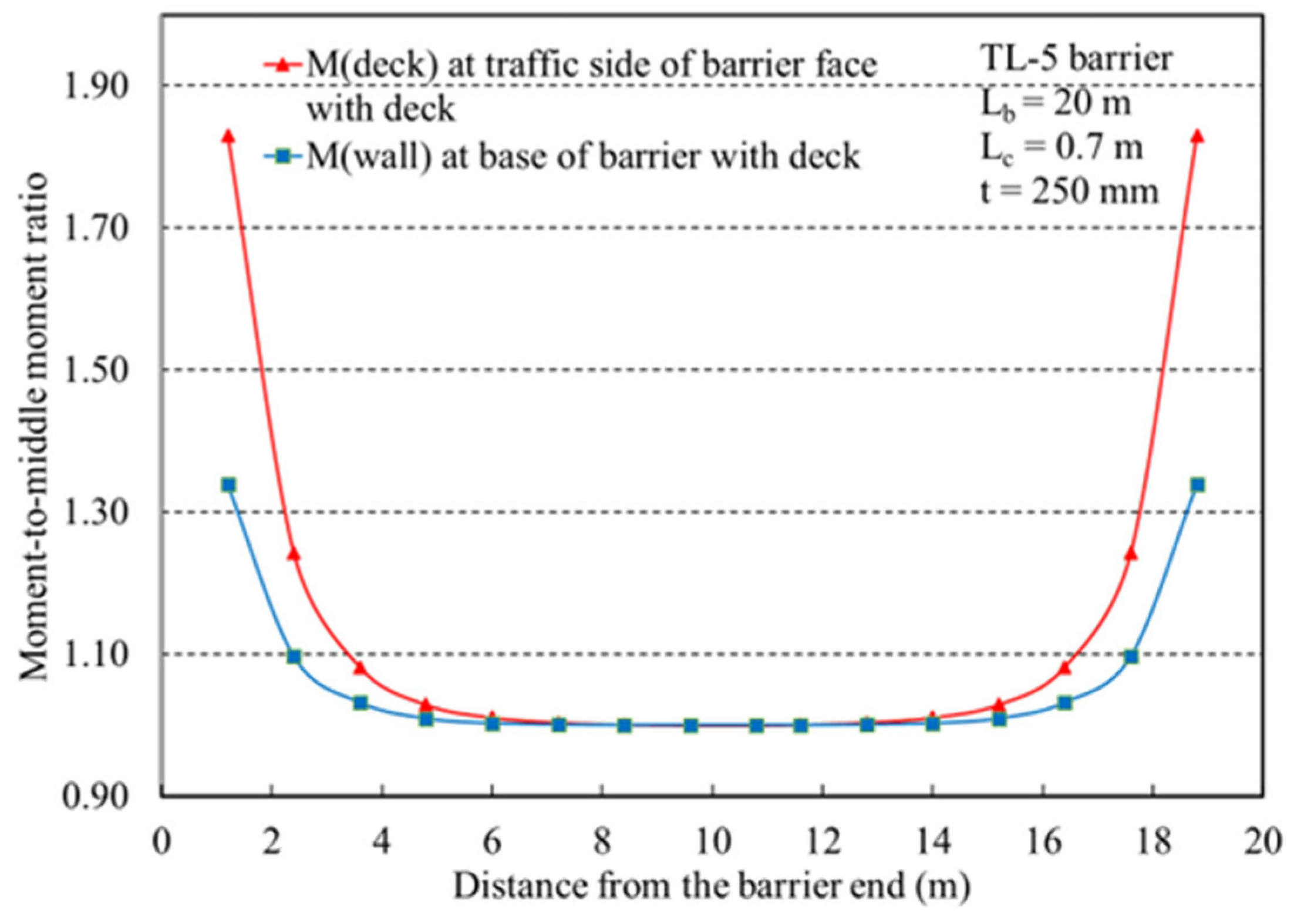 The analysis results are summarized in Figure 10 and Figure 11. Figure 10 illustrates the variation in the applied vertical moment at the barrier base with the deck and the transverse moment in the deck overhang at the inner edge of the barrier. Results were presented as the ratio of the applied moment at the barrier end to that at the barrier’s mid-length. It can be seen that the moment demand is greatest near the barrier end and gradually decreases towards the mid-length, where it stabilizes. A transition zone of approximately one loaded length (Lt) was identified, within which the moment demand drops sharply before reaching values comparable to those at the barrier mid-span. It can be observed that the applied moment at the barrier base changed from 78 to 104 kN·m/m when the load was applied at the barrier end compared to the barrier mid-length location (an increase of 34%). Also, the applied moment on the deck overhang increased from 57 kN·m/m at mid-length location to 103 kN·m/m at end location (83% increase).