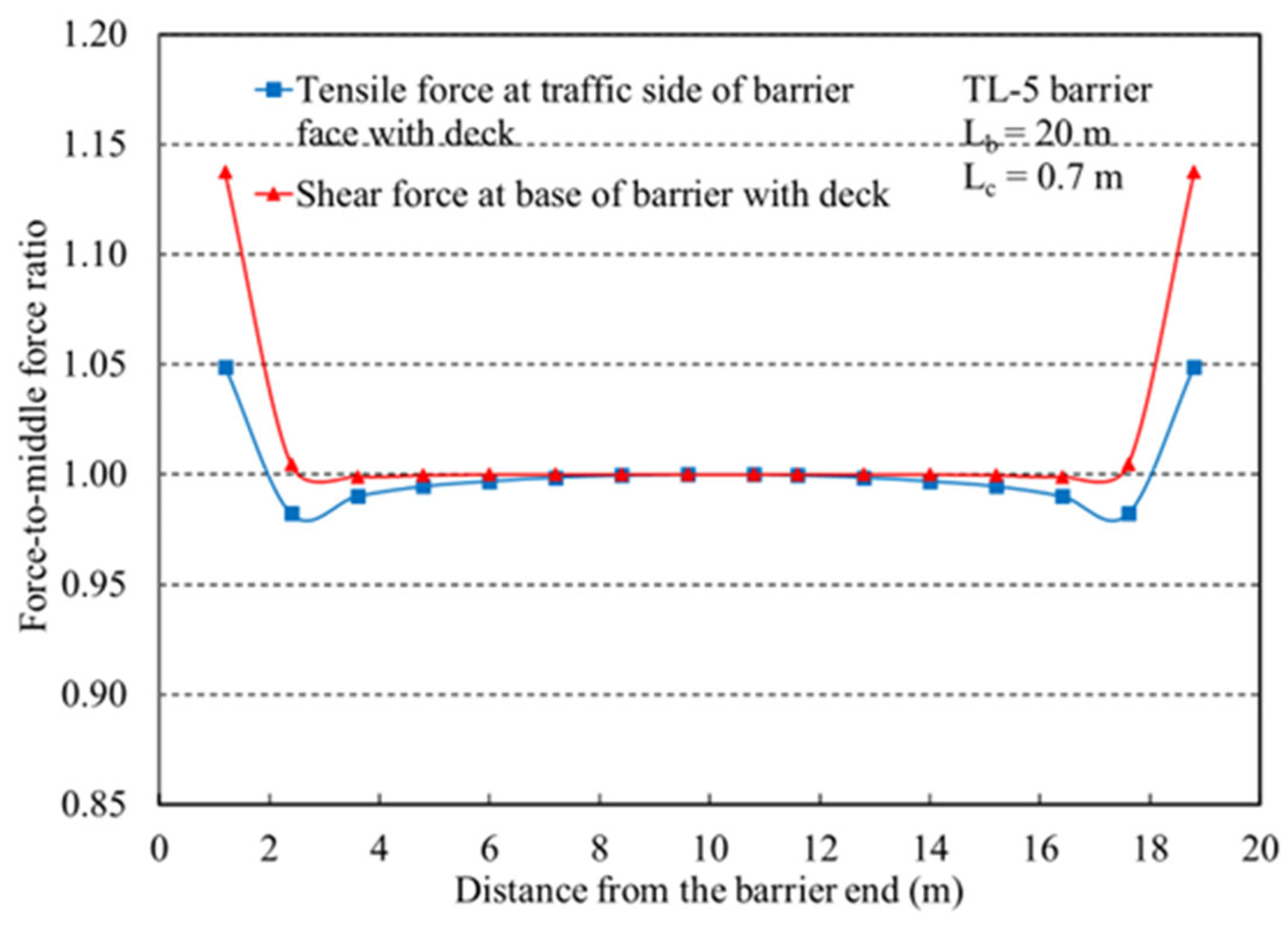 Figure 11 presents the corresponding tensile force distribution in the deck overhang as well as the shear force at the barrier base barrier wall in the form of the ratio between the demand at the barrier end and its mid-length. Similar to the moment response, the tensile force increases significantly near the barrier end and diminishes toward the mid-length. However, the transitional length for tensile force variation was found to be shorter than that for bending moment, indicating higher sensitivity of tensile stresses to end loading conditions. The applied shear force at the barrier base changed from 133 to 150 kN/m when the load was applied at the barrier end compared to the barrier mid-length location (an increase of 14%). Also, the applied tensile force on the deck overhang increased from 150 kN/m at the mid-length location to 157 kN/m at the end location (5% increase). These findings confirm that the design demand for TL-5 barriers must account for the location of transverse impact loading, especially within the transition zone, to ensure conservative and safe structural performance. A quantitative comparison of the results further clarifies the influence of load position on the structural response. When the transverse load was applied near the barrier end rather than at the interior location, the moment at the bottom of the barrier wall increased by 34%, while the moment in the deck overhang at the inner face of the barrier increased by 83%. In contrast, the shear force at the barrier base increased only by 14%, and the tensile force in the deck at the inner face of the barrier increased by only 5%. These comparisons reveal that the influence of load location is far more significant on the flexural (moment) demand than on the shear or tensile responses. Practically, this means that even moderate variations in load position can substantially affect the required flexural reinforcement and the likelihood of diagonal tension cracking at barrier ends. Therefore, considering the most critical load position in design ensures that the reinforcement layout at barrier ends provides adequate strength and stiffness under realistic impact conditions.