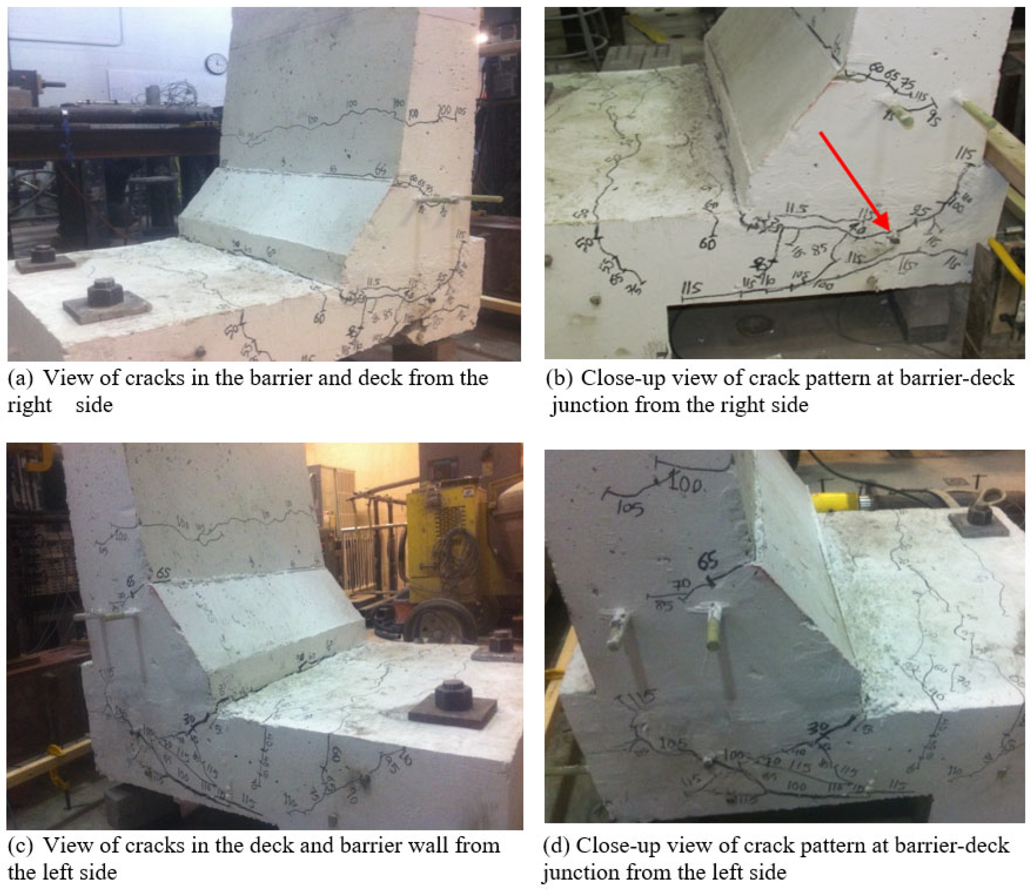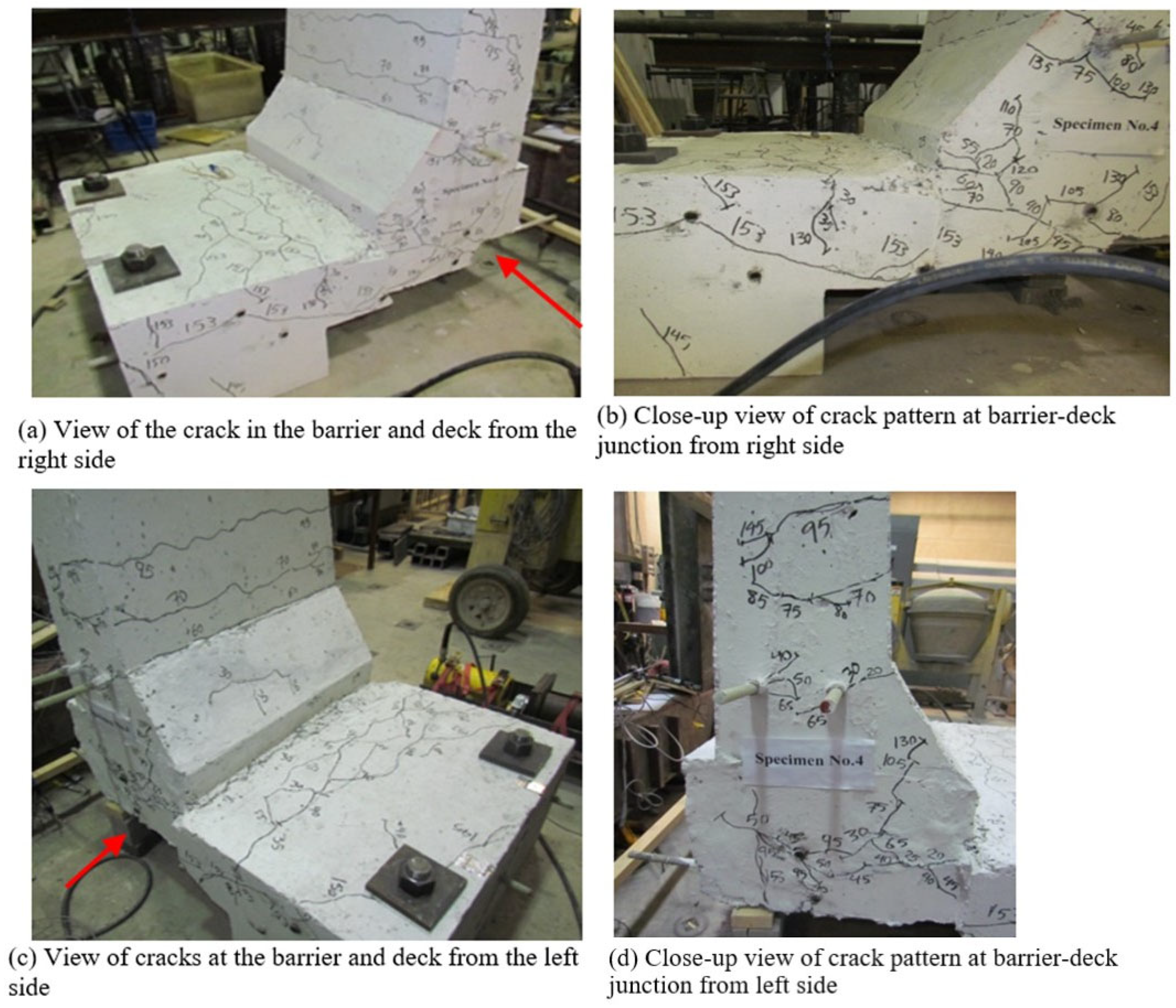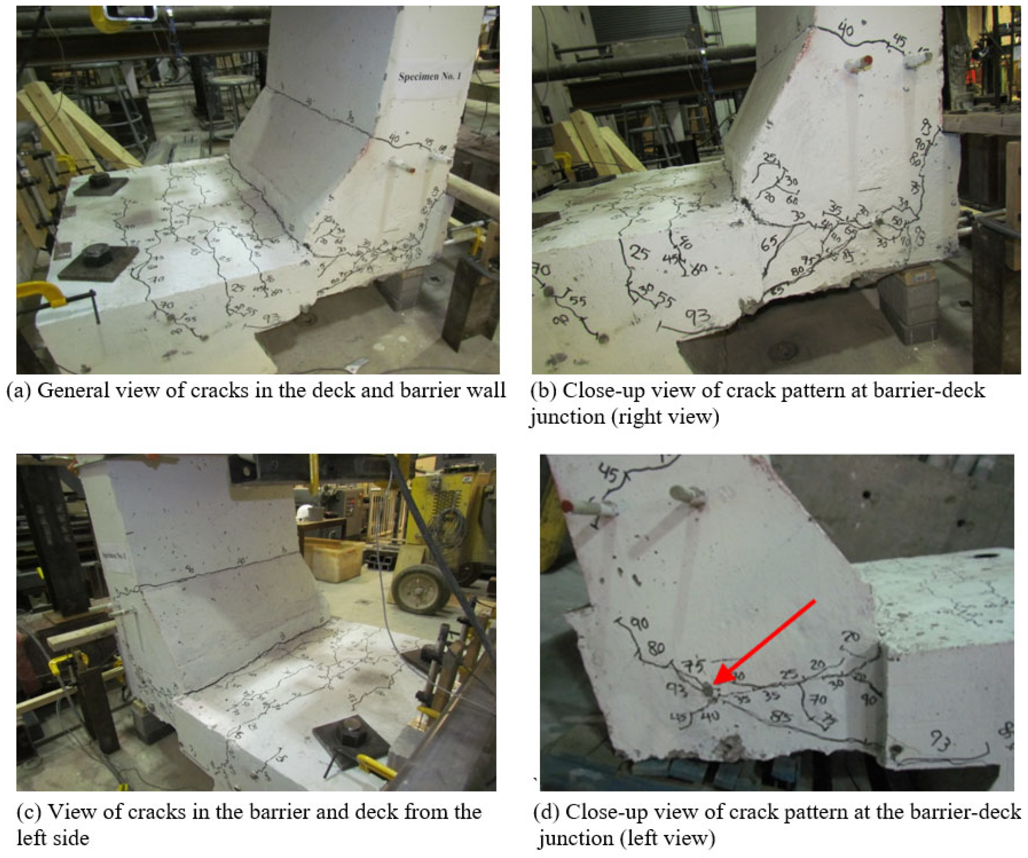 In reference to the calculations in Table 4, it is worth noting that the reinforcement detailing was primarily used to identify the bars contributing to the flexural strength calculations of the barrier wall and deck. Since all failures were governed by diagonal tension cracking in the concrete rather than by reinforcement pullout, the reinforcement layouts mainly influenced the stiffness and crack propagation behavior, while the calculated flexural capacities (Mr,w and Mr,d) reflected the theoretical participation of the effective bars in resisting flexure.
