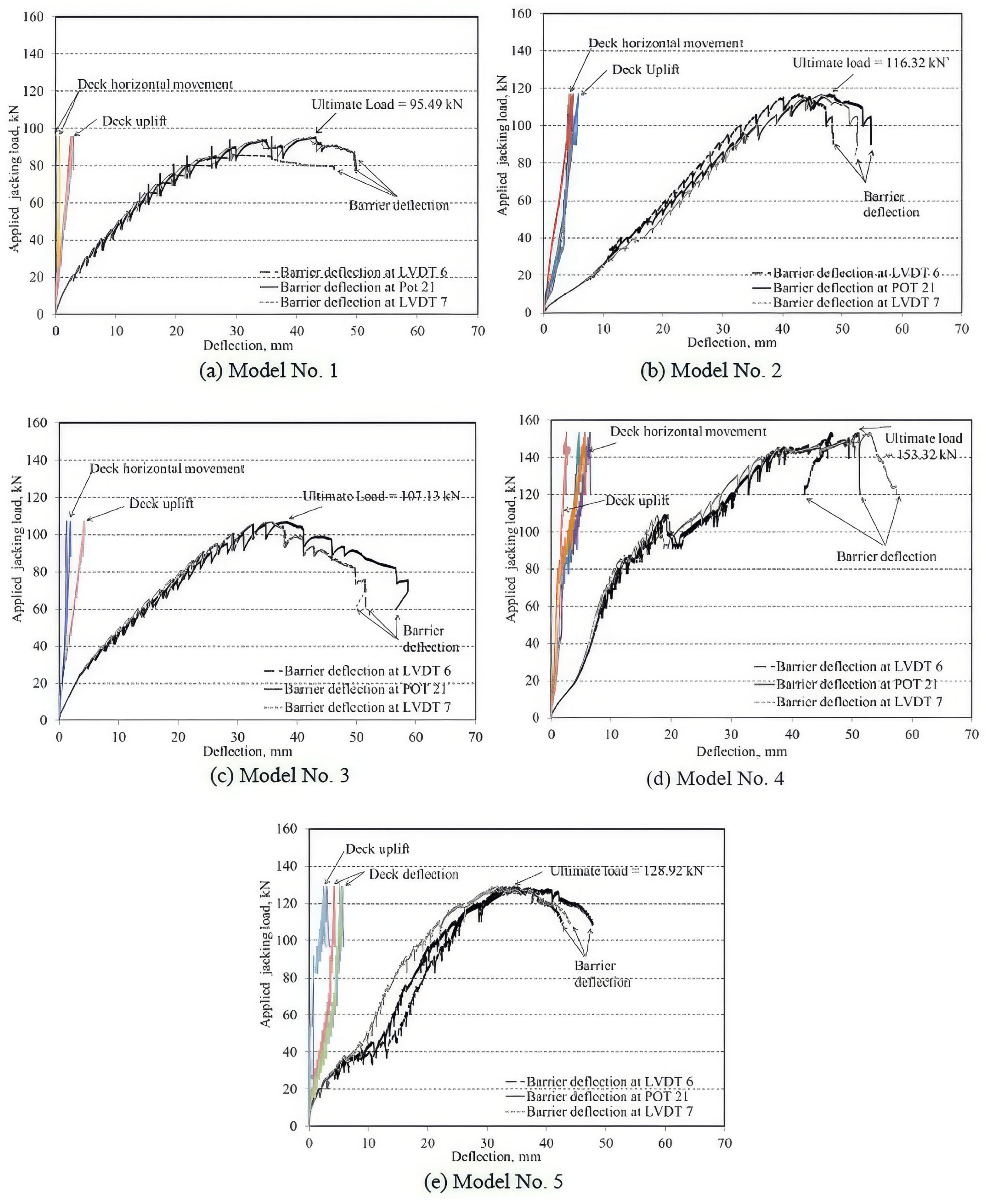 The first visible flexural crack appeared at the barrier–deck interface at a 20 kN load, extending down into the slab at the corner junction. As the load increased to 50 kN, additional flexural cracks developed throughout its thickness. At the same load, a flexural crack formed at the junction between the top and bottom tapered portions of the barrier wall, propagating through the wall thickness. At 85 kN, horizontal cracks appeared at the deck-barrier corner. When the load reached 105 kN, another flexural crack emerged in the top portion of the tapered wall and extended through its thickness, accompanied by additional cracks on the top surface of the deck slab. Further loading caused the cracks to widen, culminating in barrier failure at 128.92 kN at the deck-barrier corner under combined tension and flexure. The maximum moment at the barrier–deck junction was 127.3 kN·m/m, exceeding the CHBDC factored design moment of 78 kN·m/m for interior locations. At failure, the barrier wall exhibited a net lateral deflection of 17.8 mm, accompanied by a horizontal displacement of 5.0 mm in the deck slab and an uplift of 2.6 mm. Figure 13e presents the load–deflection response for Barrier Model 5.