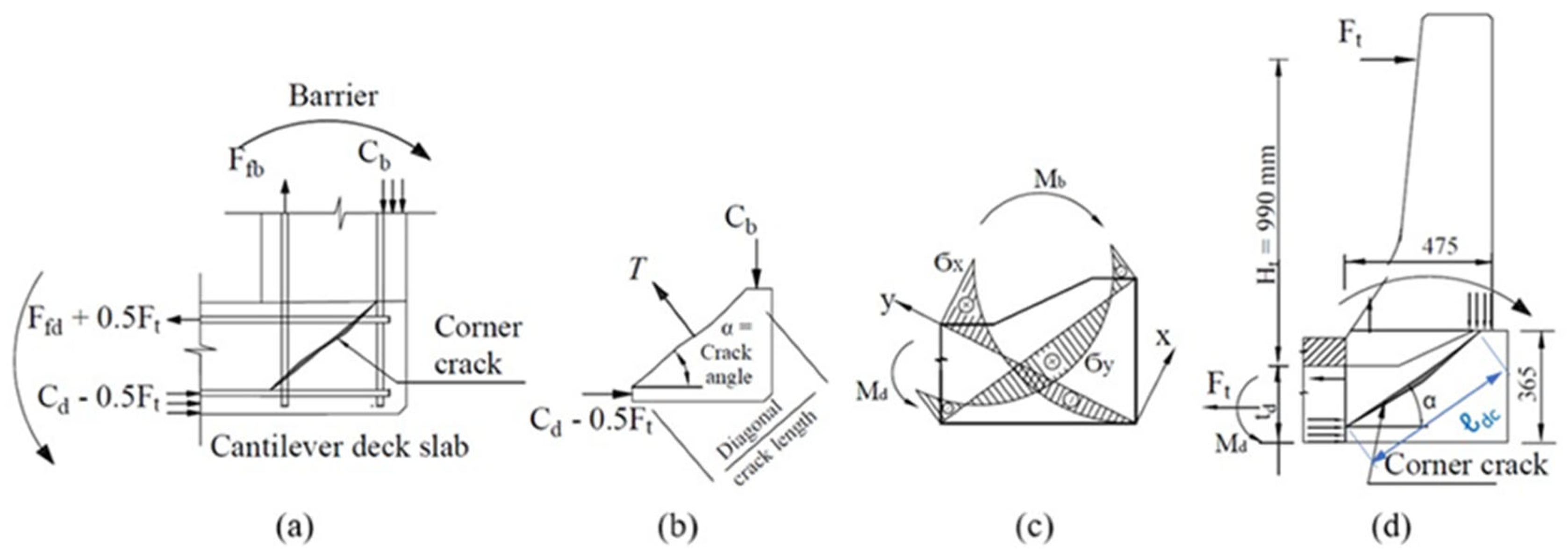 Here, α represents the angle of the diagonal tension crack, and Cb denotes the resultant compressive force in the barrier wall. To determine the diagonal crack angle between the forces Cb and (Cd − 0.5Ft), a conservative assumption is made that their points of action are located at approximately 0.8 times the barrier thickness at the barrier–deck interface and 0.8 times the deck slab thickness at the inner face of the barrier wall, respectively, as illustrated in Figure 18d. This formed triangle can be used to determine the diagonal tension crack length, dc, shown in Figure 18d.