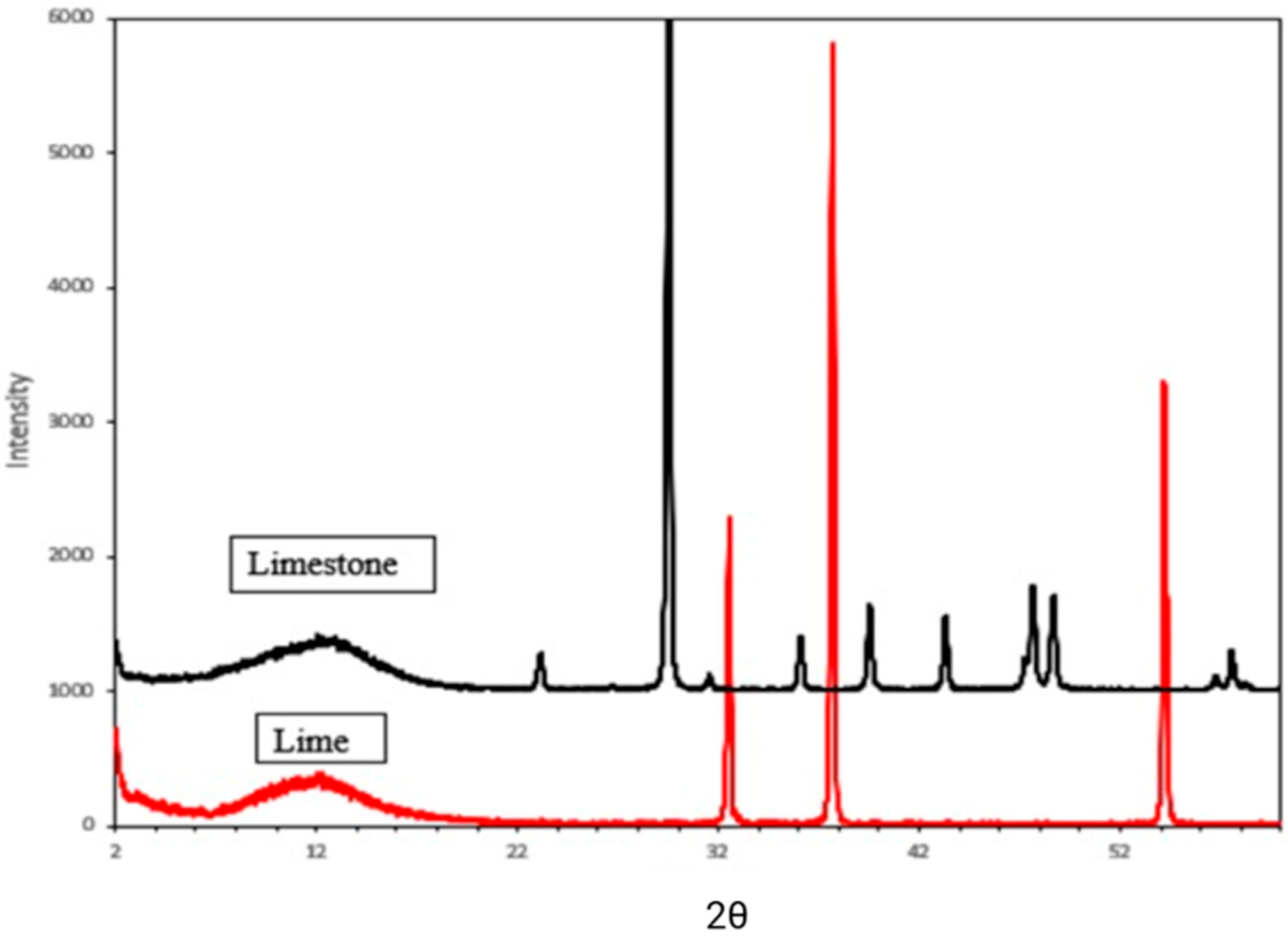 2 elimination. Experiments were conducted by varying crucible sizes (100 × 80, 80 × 50, and 40 × 40 mm), limestone weights (1, 2, and 3 g), and calcination durations (1, 2, and 3 h). The crucible size and sample mass were adjusted to maintain uniform heating and prevent incomplete calcination or material loss. XRD analysis confirmed that all batches achieved full conversion to CaO under the selected conditions. Calcination was performed in a muffle furnace at 1000 °C, and the resulting lime structure was confirmed via XRD analysis. Cooled samples were stored in sealed glass vials for subsequent use [