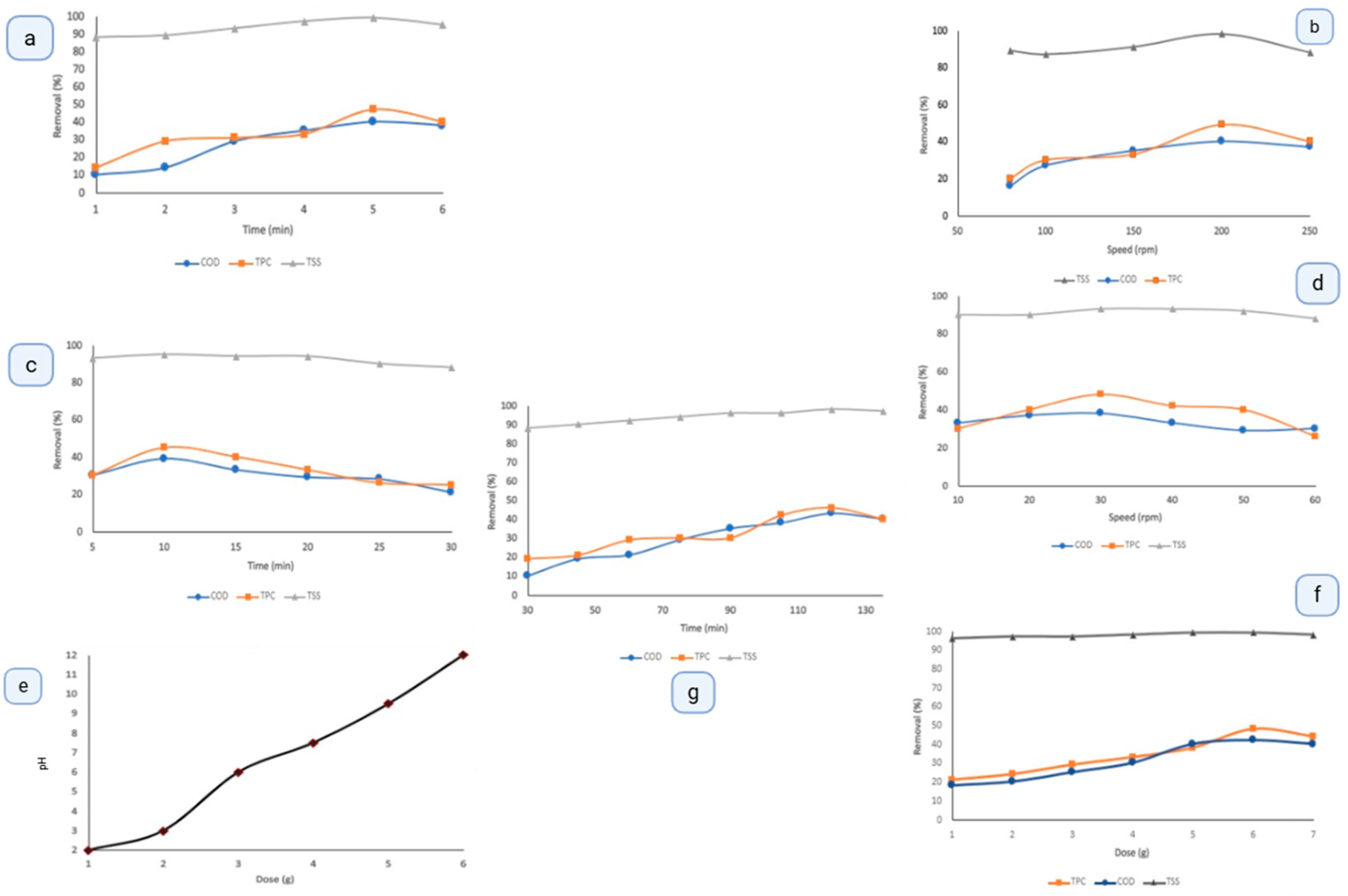 38]. Under optimized conditions, the removal efficiencies for TSS, COD, and TPC were 99%, 43%, and 48%, respectively.