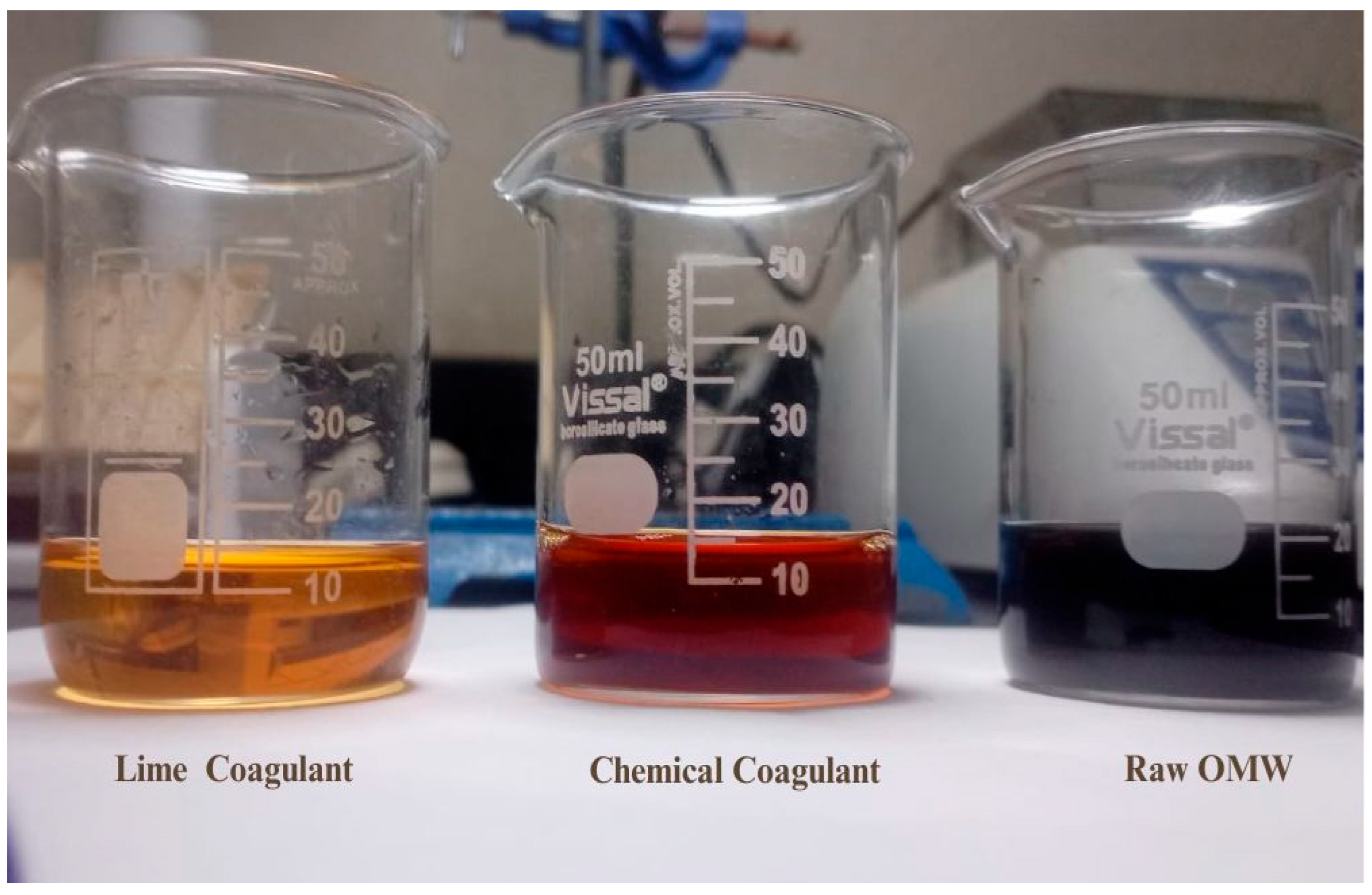 Figure 7 shows the color changes in OMW after treatment with lime and a chemical coagulant compared to raw OMW. The raw OMW exhibits a dark brown to black color, reflecting its high content of phenolic compounds and organic matter. After lime pretreatment, the color noticeably lightens to a yellowish hue, indicating effective coagulation and partial removal of colored organic compounds. Treatment with the chemical coagulant also reduces the color, producing a reddish-brown solution, which suggests that it is somewhat effective but less efficient than lime in decolorization. These observations support the conclusion that lime is highly effective in removing chromophoric substances from OMW, likely due to pH adjustment, coagulation, and adsorption mechanisms.