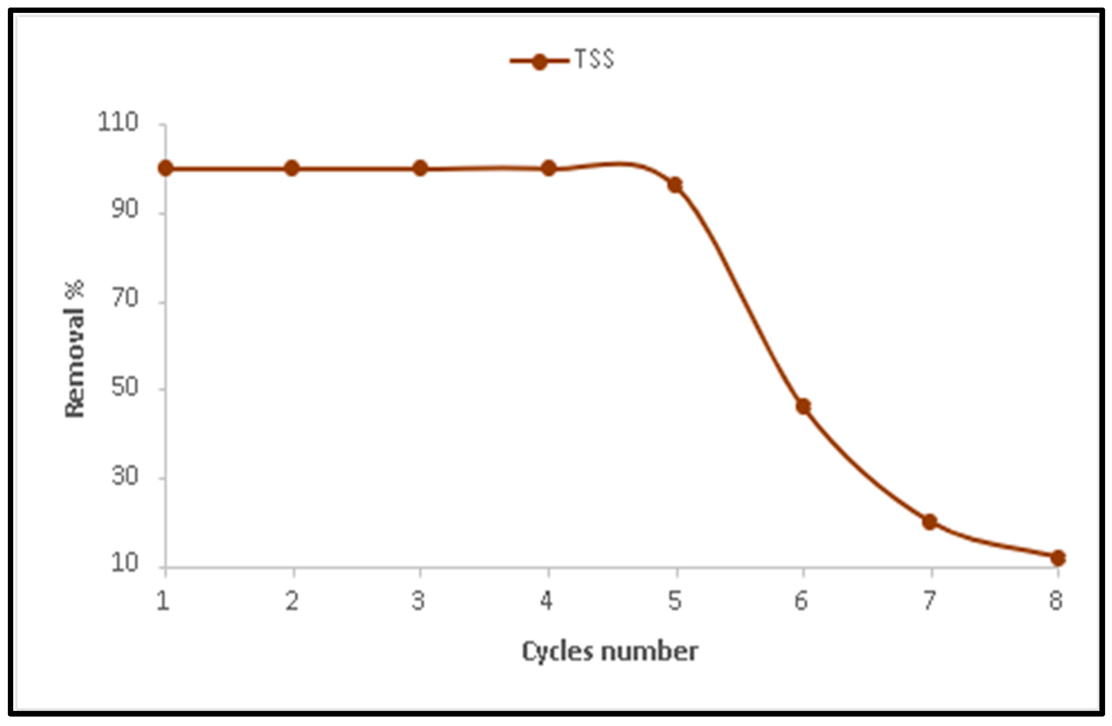 This part of the study aimed to evaluate the reusability of lime (CaO) in treating olive mill wastewater (OMW) and to monitor any changes in its effectiveness over multiple cycles. The results showed that lime performance remained relatively stable through the first five cycles, as illustrated in