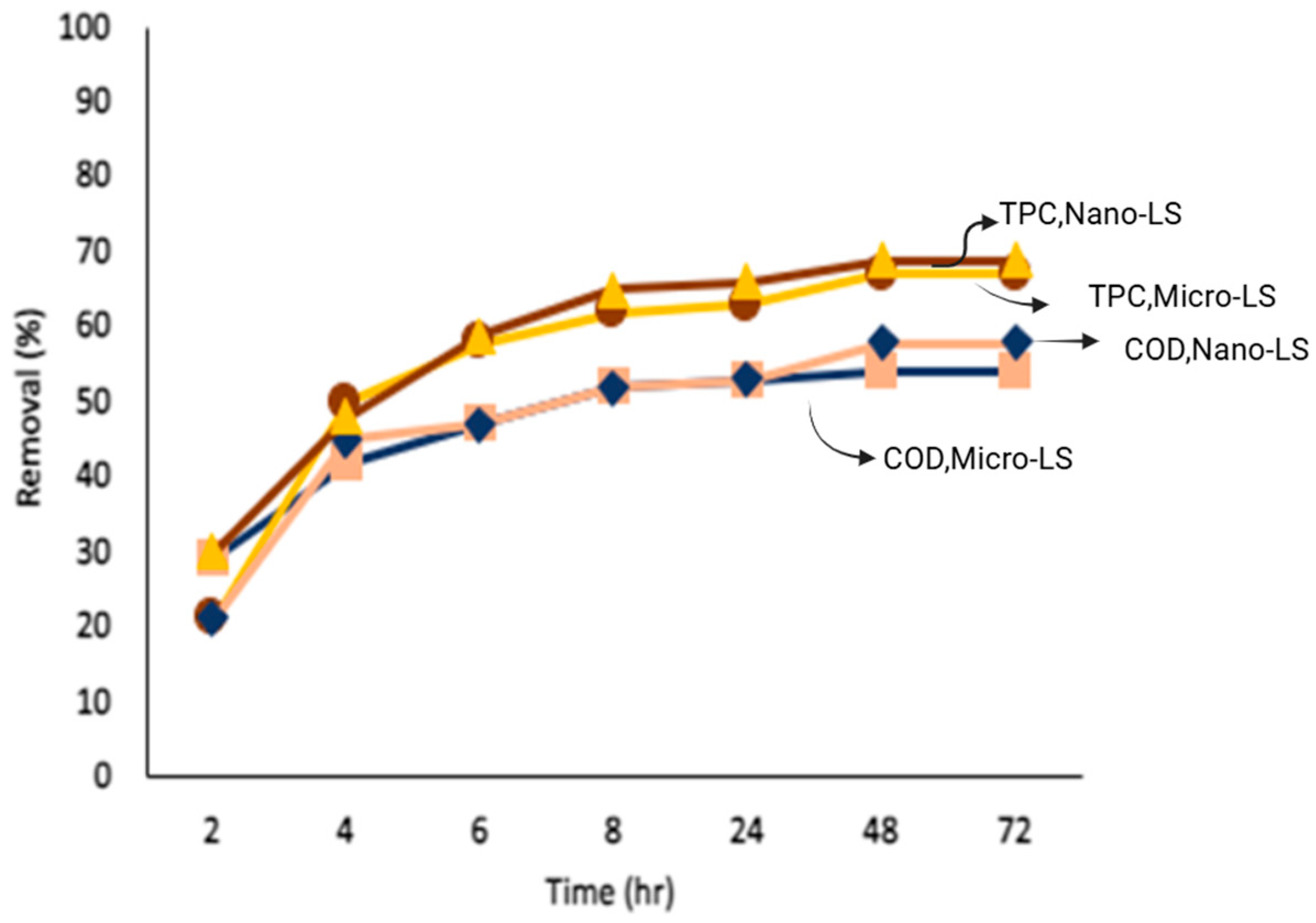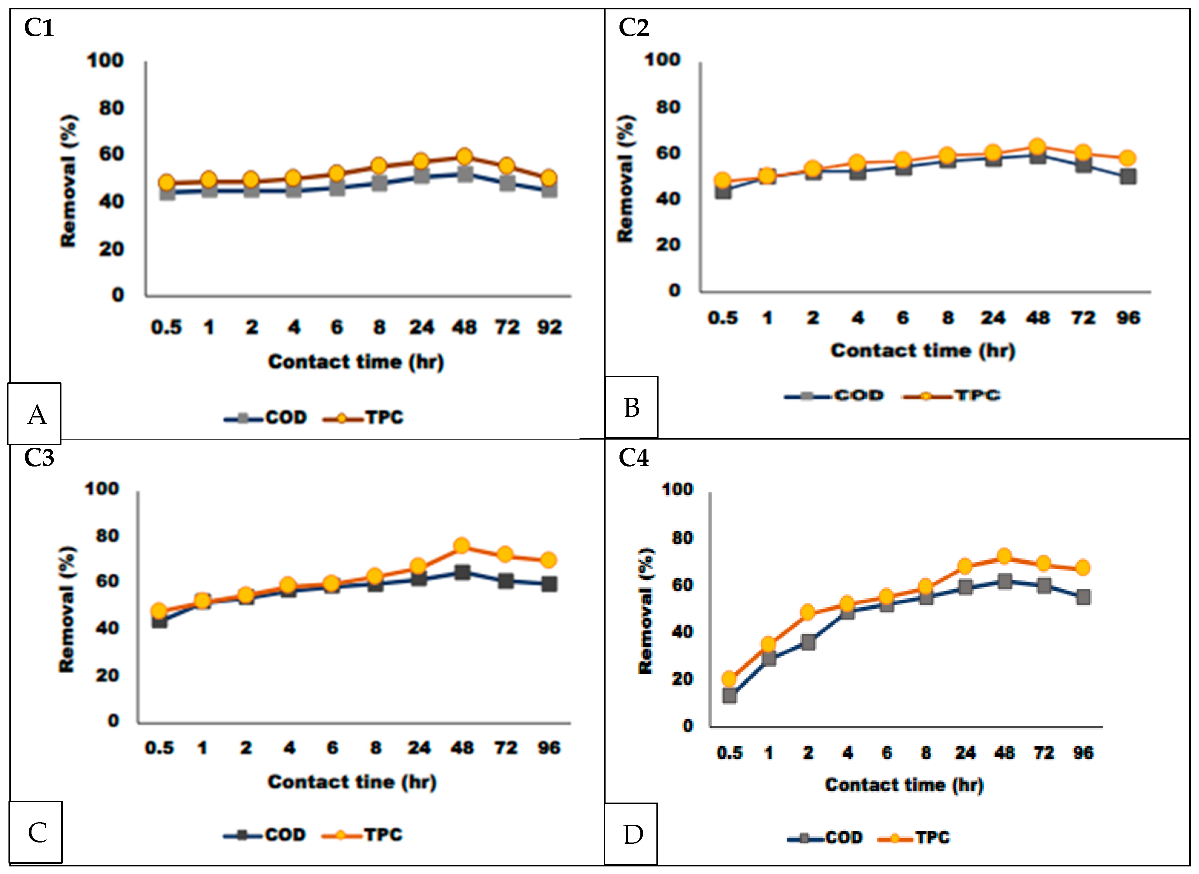 39], who reported that higher pH values enhance removal efficiency. The post 48 h decline may be due to factors such as particle settling or saturation of adsorption sites. Under these conditions, the maximum TPC and COD removal efficiencies were 59% and 52%, respectively (