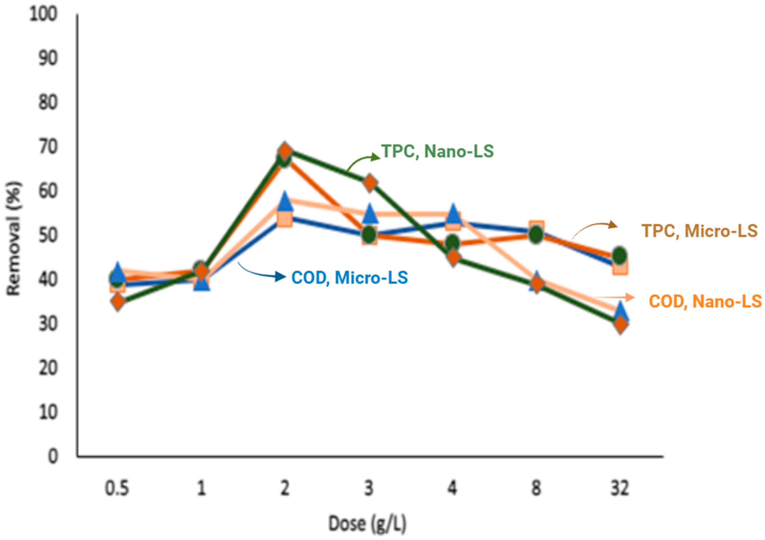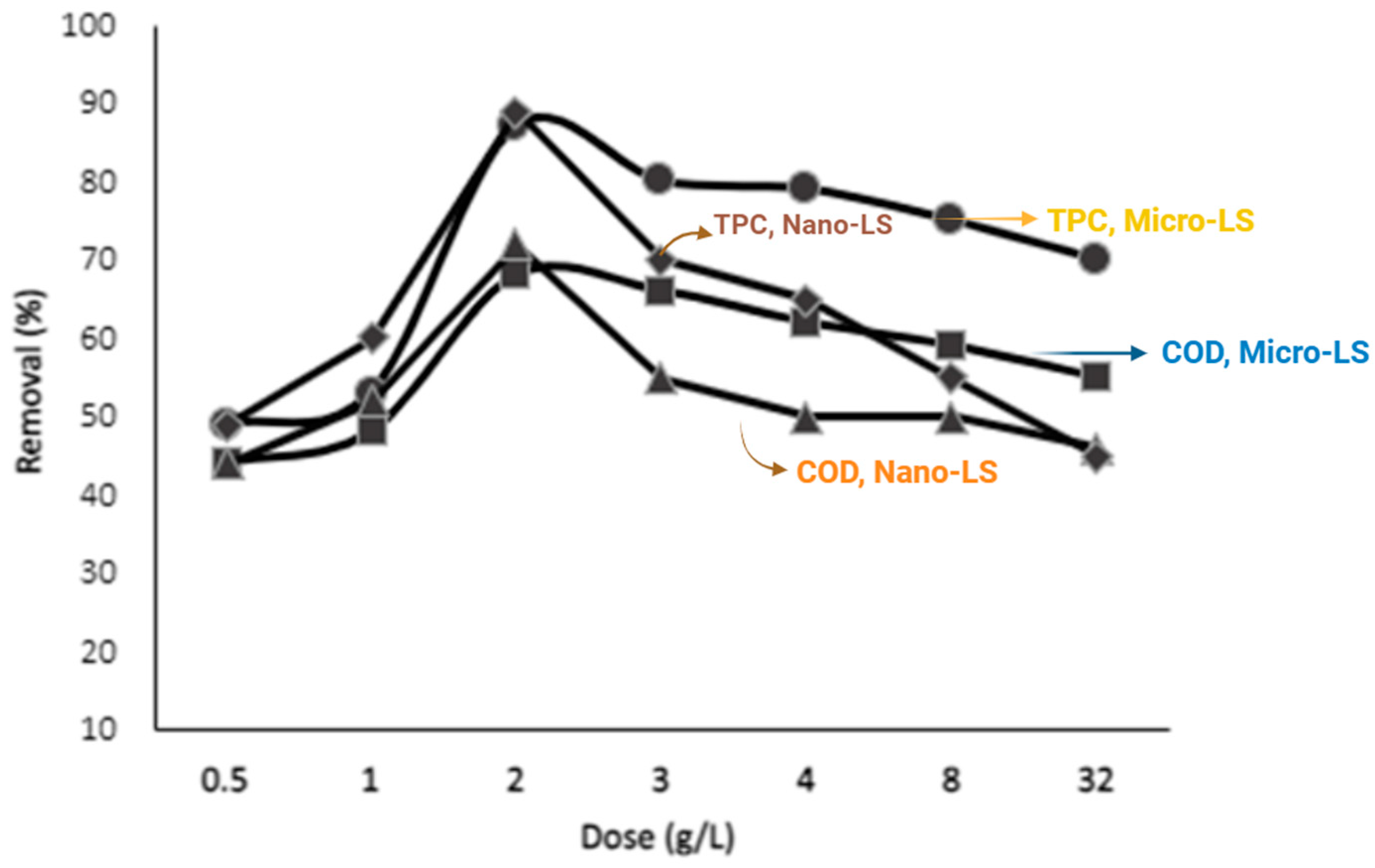 36], which reduces the effective surface area available for adsorption. Aggregation reduces the number of accessible adsorption sites by increasing adsorption density, thereby limiting the effectiveness of the adsorbent. This trend was more pronounced for Nano-LS, where finer particles tend to agglomerate more readily at high dosages.