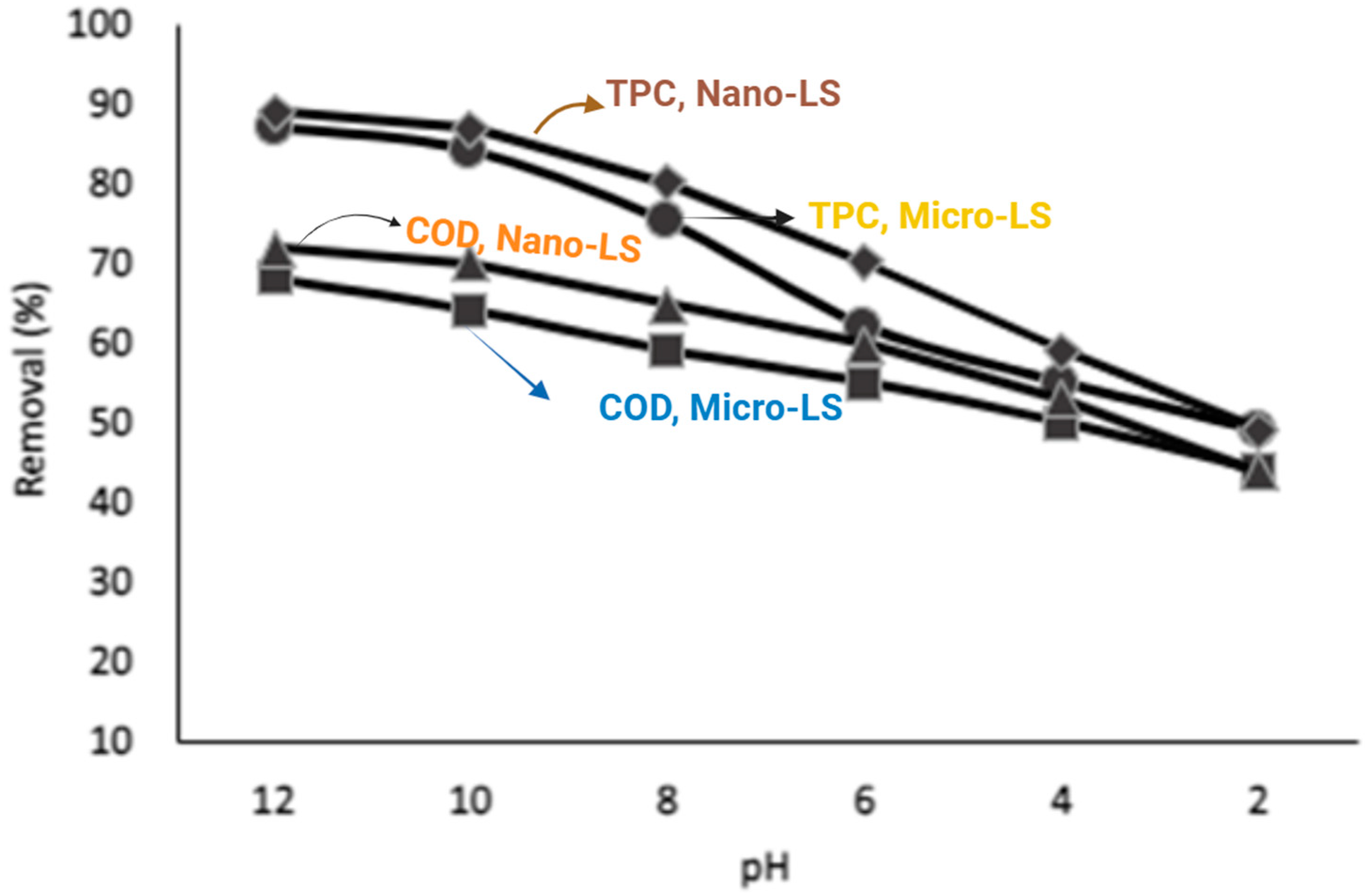 Figure 14). Maximum COD and TPC removal occurred near pH 8, where partial deprotonation of phenolic compounds enhances electrostatic attraction with the positively charged limestone surface (pHpzc ≈ 8.3). Under lime pretreatment, OMW initially exhibited higher pH values (~12), which were gradually neutralized during treatment using HCL.