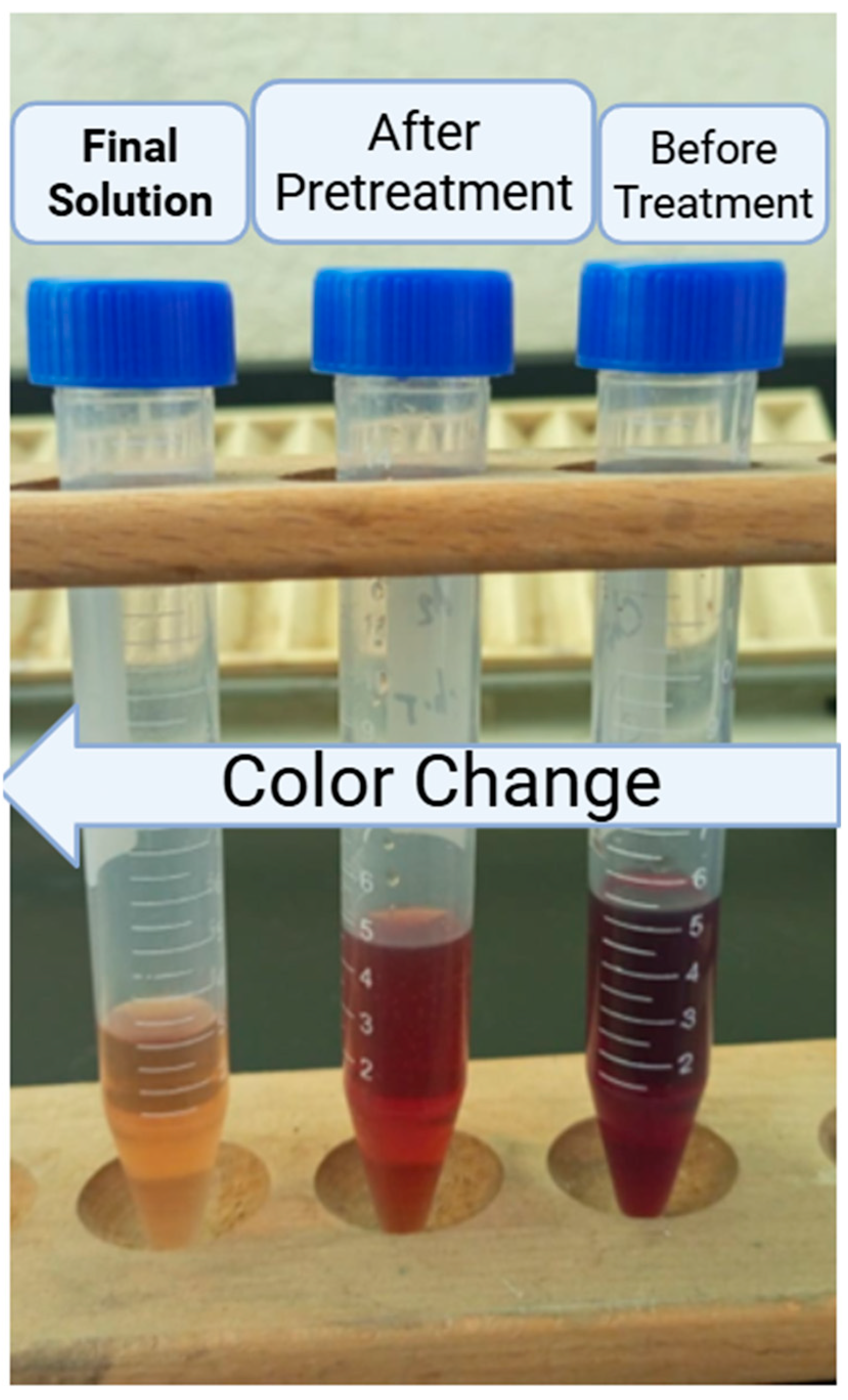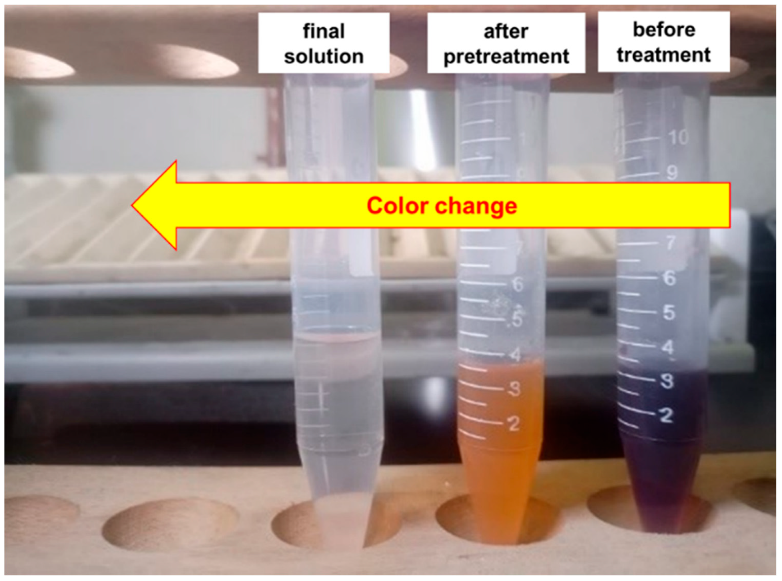 Figure 16 illustrates the color changes observed in olive mill wastewater (OMW) after lime pretreatment. The figure clearly shows a noticeable shift in coloration (from dark/black color to colorless solution), indicating a reduction in the intensity of the dark brown/black color typically associated with untreated OMW. This color change suggests effective removal or destabilization of suspended solids, polyphenols, and other chromophores during the lime treatment. The lighter color reflects the coagulant and adsorptive action of lime, which promotes precipitation of organic matter and enhances the clarity of wastewater. These visual changes corroborate the quantitative improvements observed in parameters such as total phenolic content (TPC) and chemical oxygen demand (COD), supporting the efficacy of lime as a pretreatment method.