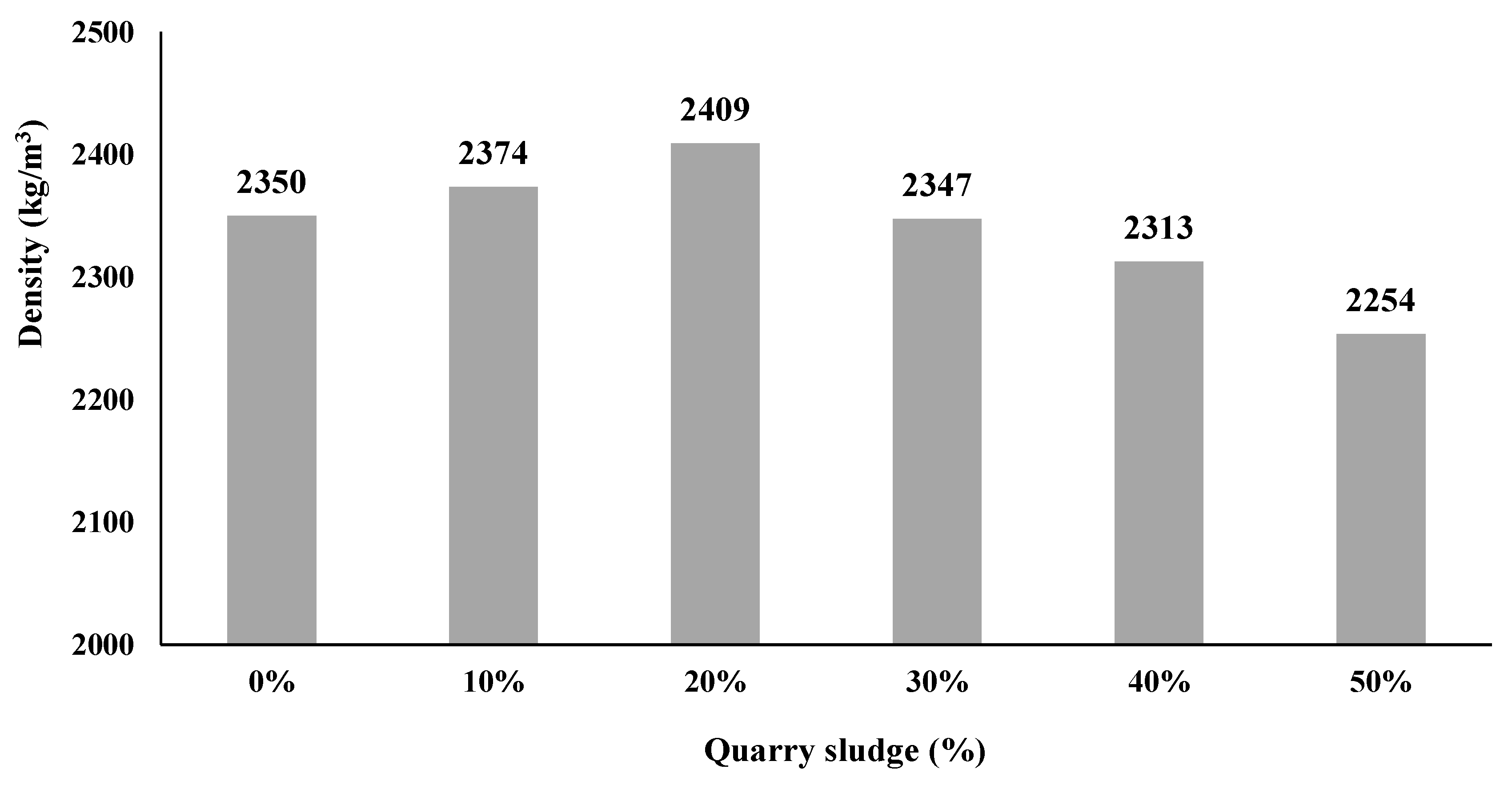 Figure 3. This data reveals a clear trend in how the inclusion of quarry sludge influences the density of the concrete as the replacement percentage varies.