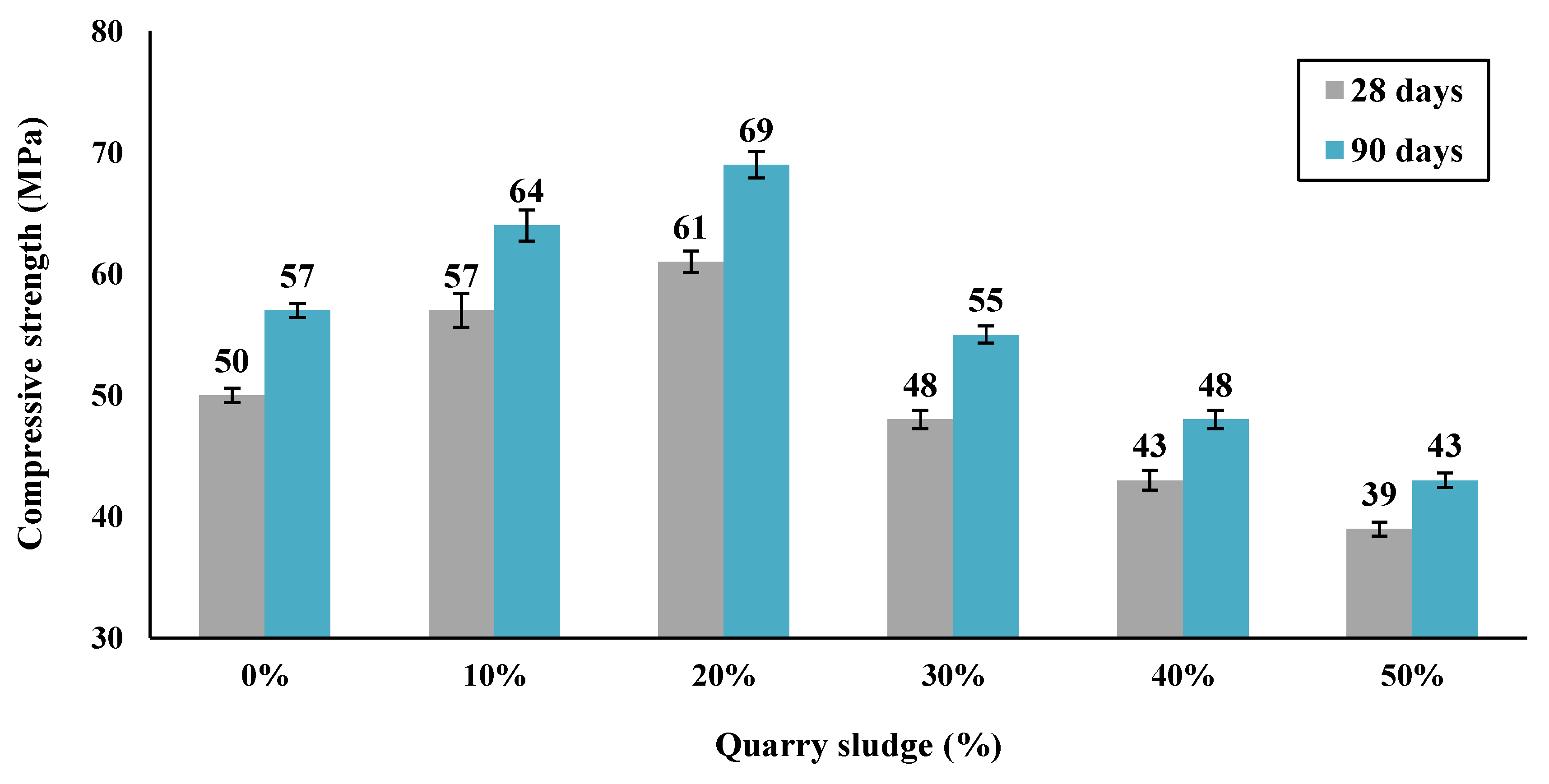 Figure 4. These data reveal a clear and noteworthy trend in how the percentage of quarry sludge affects the mechanical performance of HSC, particularly its load-bearing capacity.